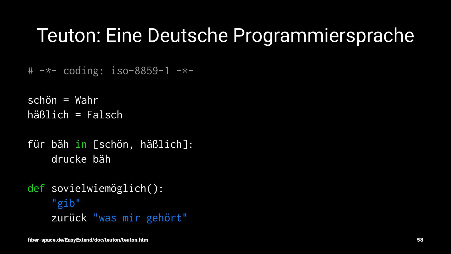 = Wahr häßlich = Falsch für bäh in [schön, häßlich]: drucke bäh def sovielwiemöglich(): "gib" zurück "was mir gehört" fiber-space.de/EasyExtend/doc/teuton/teuton.htm 58
