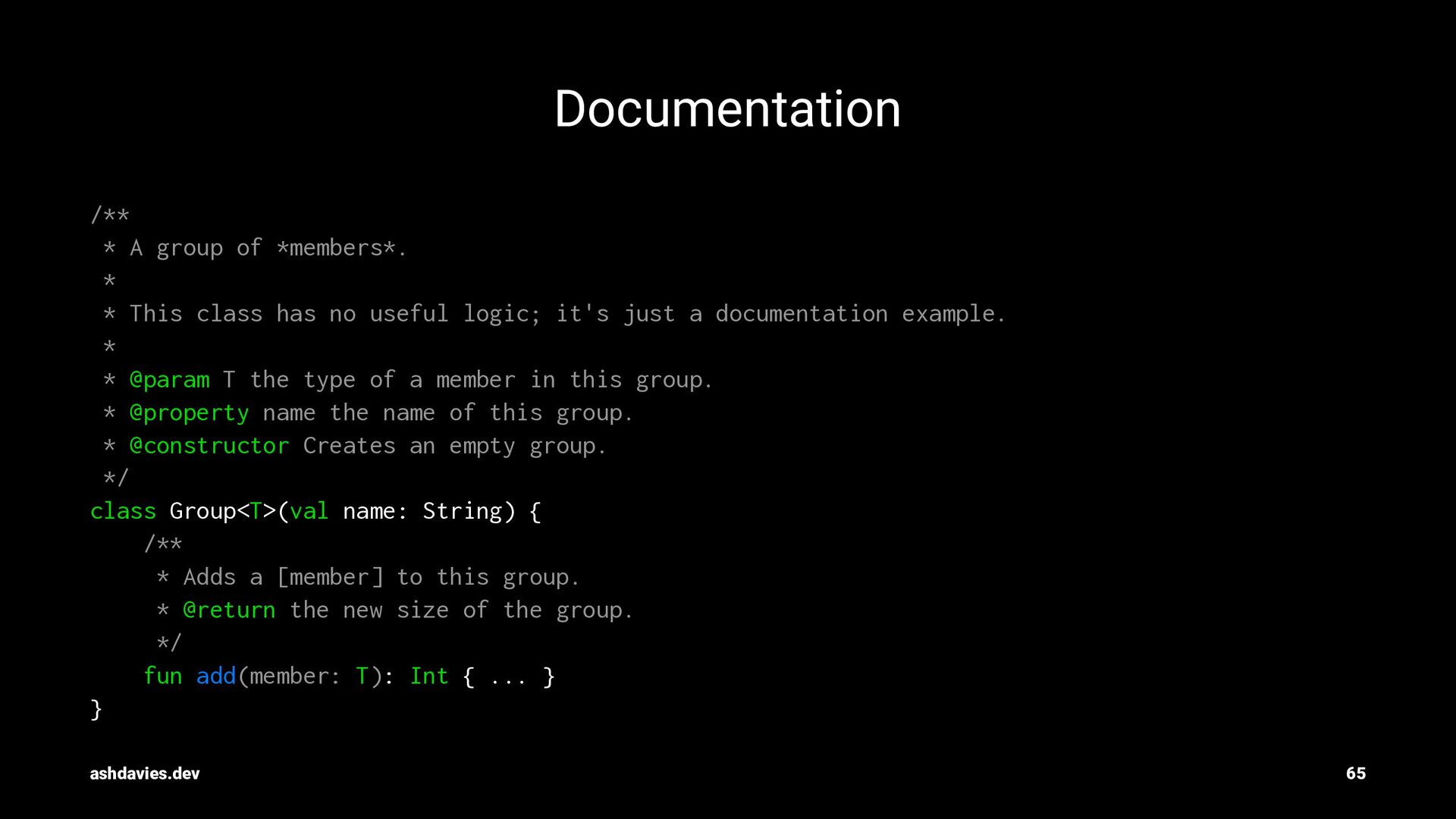 class has no useful logic; it's just a documentation example. * * @param T the type of a member in this group. * @property name the name of this group. * @constructor Creates an empty group. */ class Group<T>(val name: String) { /** * Adds a [member] to this group. * @return the new size of the group. */ fun add(member: T): Int { ... } } ashdavies.dev 65