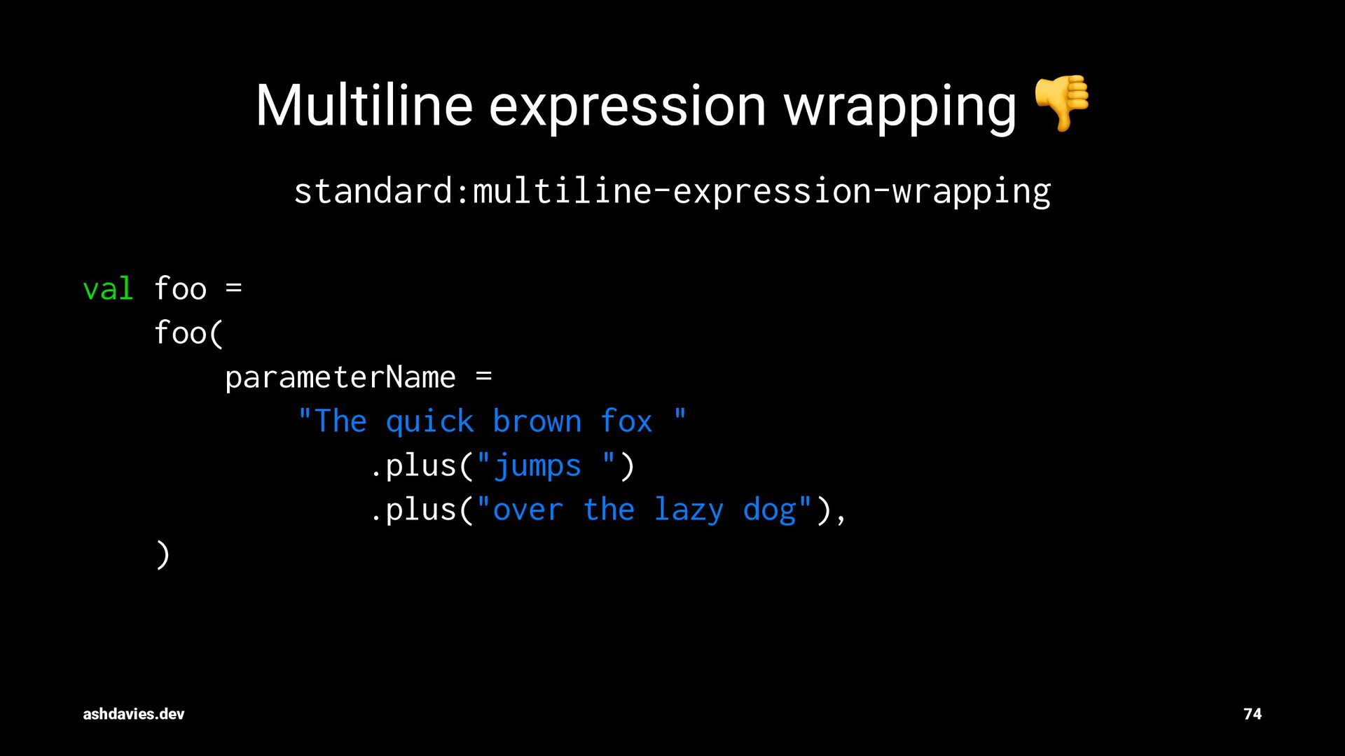"The quick brown fox " .plus("jumps ") .plus("over the lazy dog"), ) ashdavies.dev 74
