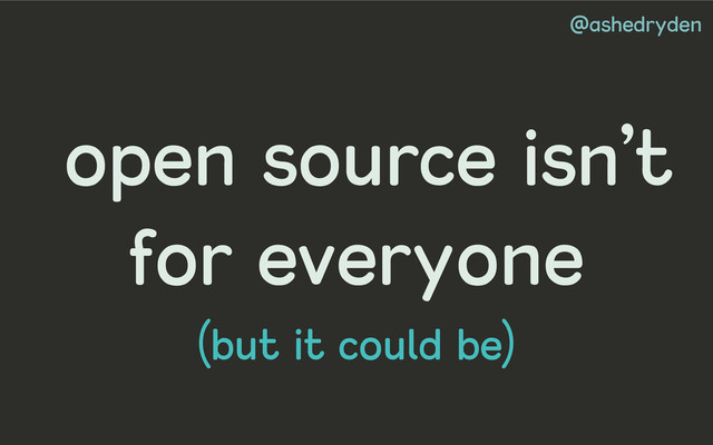 The state of diversity in open source contributions is abysmal. With the number of female OSS contributors at a shockingly low 1.5% and other groups not even documented, we need to ask what we can be doing better as a community. We’ll discuss the barriers that people face contributing to our open source projects and what we can do to increase participation.