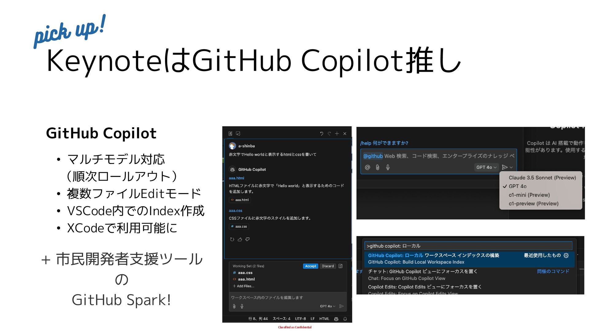 Classified as Confidential KeynoteはGitHub Copilot推し • マルチモデル対応 (順次ロールアウト) • 複数ファイルEditモード