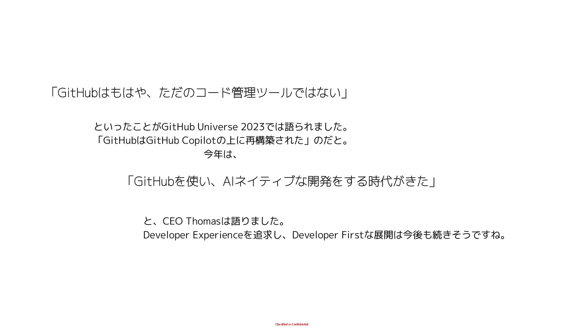 Classified as Confidential 「GitHubはもはや、ただのコード管理ツールではない」 といったことがGitHub Universe 2023では語られました。 「GitHubはGitHub Copilotの上に再構築された」のだと。 今年は、