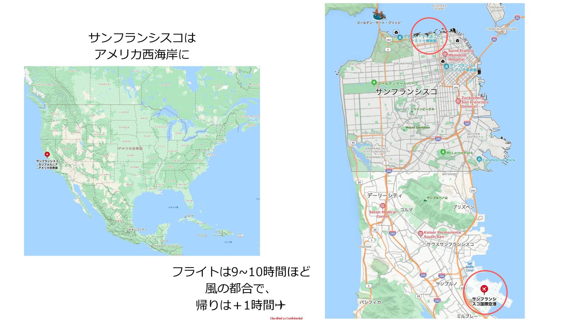 Classified as Confidential サンフランシスコは アメリカ西海岸に フライトは9~10時間ほど 風の都合で、 帰りは+1時間