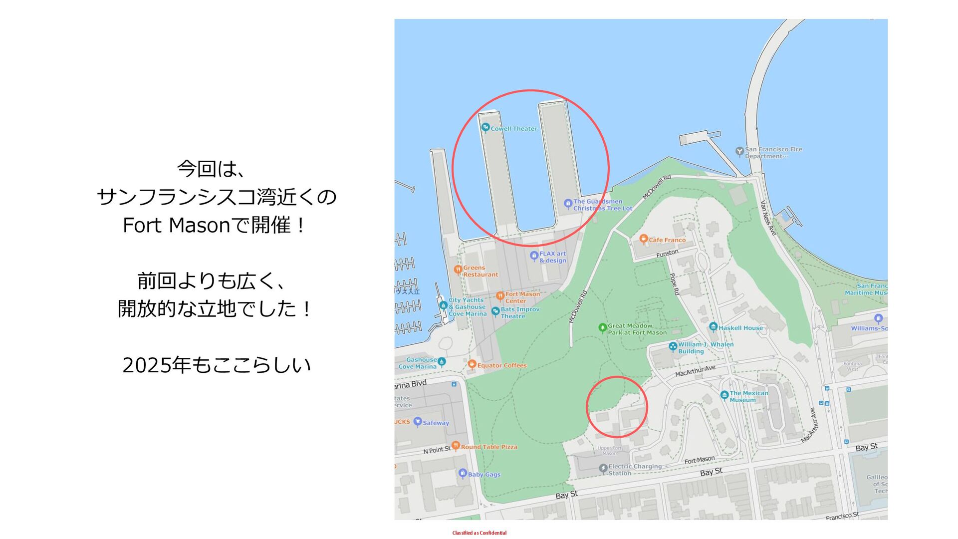 Classified as Confidential 今回は、 サンフランシスコ湾近くの Fort Masonで開催! 前回よりも広く、 開放的な立地でした! 2025年もここらしい
