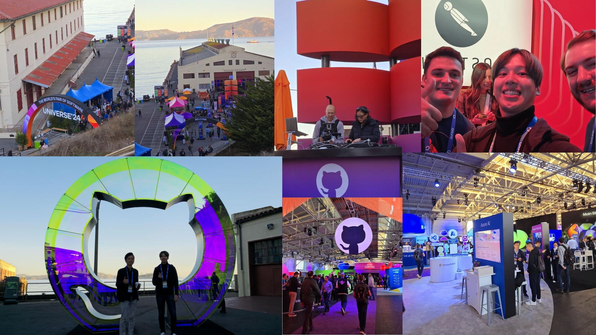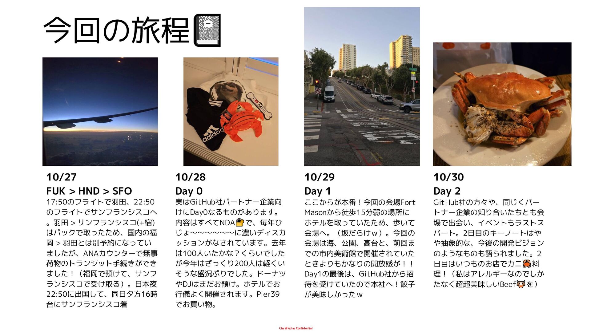 岡 > 羽田とは別予約になってい ましたが、ANAカウンターで無事 荷物のトランジット手続きができ ました!(福岡で預けて、サンフ ランシスコで受け取る)。日本夜 22:50に出国して、同日夕方16時 台にサンフランシスコ着 10/27 FUK > HND > SFO 10/30 Day 2 10/29 Day 1 10/28 Day 0 実はGitHub社パートナー企業向 けにDay0なるものがあります。 内容はすべてNDA で、毎年ひ じょ〜〜〜〜〜〜に濃いディスカ ッションがなされています。去年 は100人いたかな?くらいでした が今年はざっくり200人は軽くい そうな盛況ぷりでした。ドーナツ やDJはまだお預け。ホテルでお 行儀よく開催されます。Pier39 でお買い物。 ここからが本番!今回の会場Fort Masonから徒歩15分弱の場所に ホテルを取っていたため、歩いて 会場へ。(坂だらけw)。今回の 会場は海、公園、高台と、前回ま での市内美術館で開催されていた ときよりもかなりの開放感が!! Day1の最後は、GitHub社から招 待を受けていたので本社へ!餃子 が美味しかったw GitHub社の方々や、同じくパー トナー企業の知り合いたちとも会 場で出会い、イベントもラストス パート。2日目のキーノートはや や抽象的な、今後の開発ビジョン のようなものも語られました。2 日目はいつものお店でカニ 料 理!(私はアレルギーなのでしか たなく超超美味しいBeef を)
