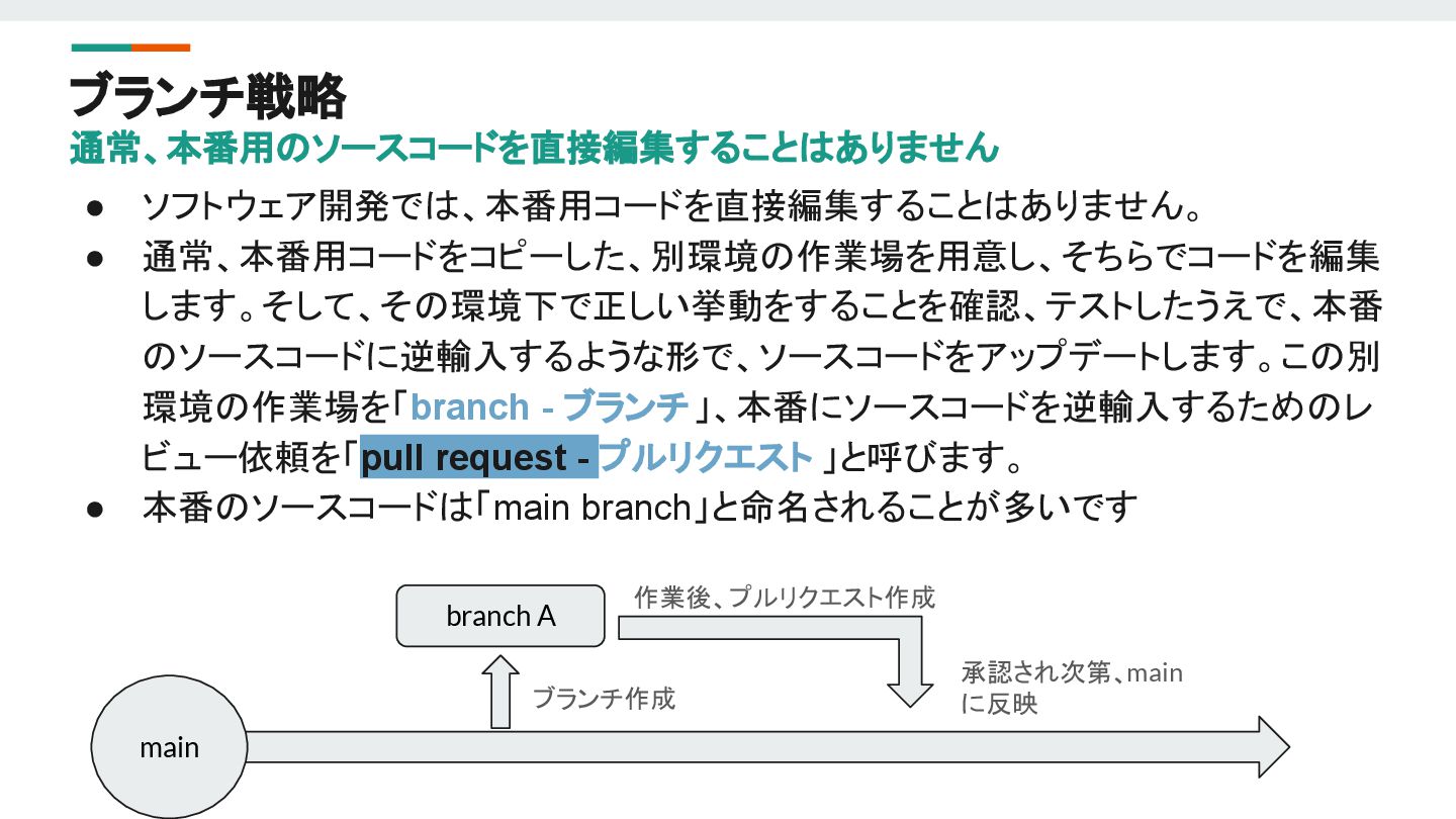 ビュー依頼を「pull request - プルリクエスト 」と呼びます。 • 本番のソースコードは「main branch」と命名されることが多いです main branch A ブランチ作成 作業後、プルリクエスト作成 承認され次第、main に反映 ブランチ戦略