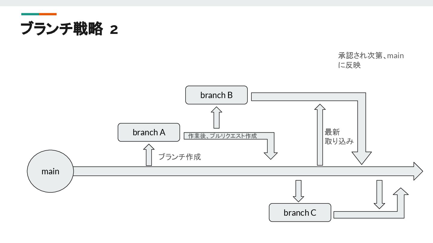 main branch A ブランチ作成 作業後、プルリクエスト作成 承認され次第、main に反映 ブランチ戦略 2 branch