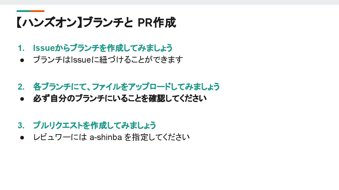 1. Issueからブランチを作成してみましょう • ブランチはIssueに紐づけることができます 2. 各ブランチにて、ファイルをアップロードしてみましょう • 必ず自分のブランチにいることを確認してください 3. プルリクエストを作成してみましょう