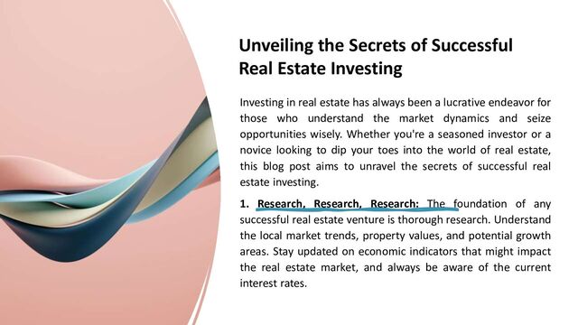real estate has always been a lucrative endeavor for those who understand the market dynamics and seize opportunities wisely. Whether you're a seasoned investor or a novice looking to dip your toes into the world of real estate, this blog post aims to unravel the secrets of successful real estate investing. 1. Research, Research, Research: The foundation of any successful real estate venture is thorough research. Understand the local market trends, property values, and potential growth areas. Stay updated on economic indicators that might impact the real estate market, and always be aware of the current interest rates.