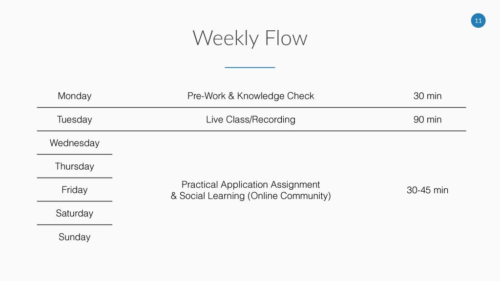 Tuesday Live Class/Recording 90 min Wednesday Practical Application Assignment & Social Learning (Online Community) 30-45 min Thursday Friday Saturday Sunday