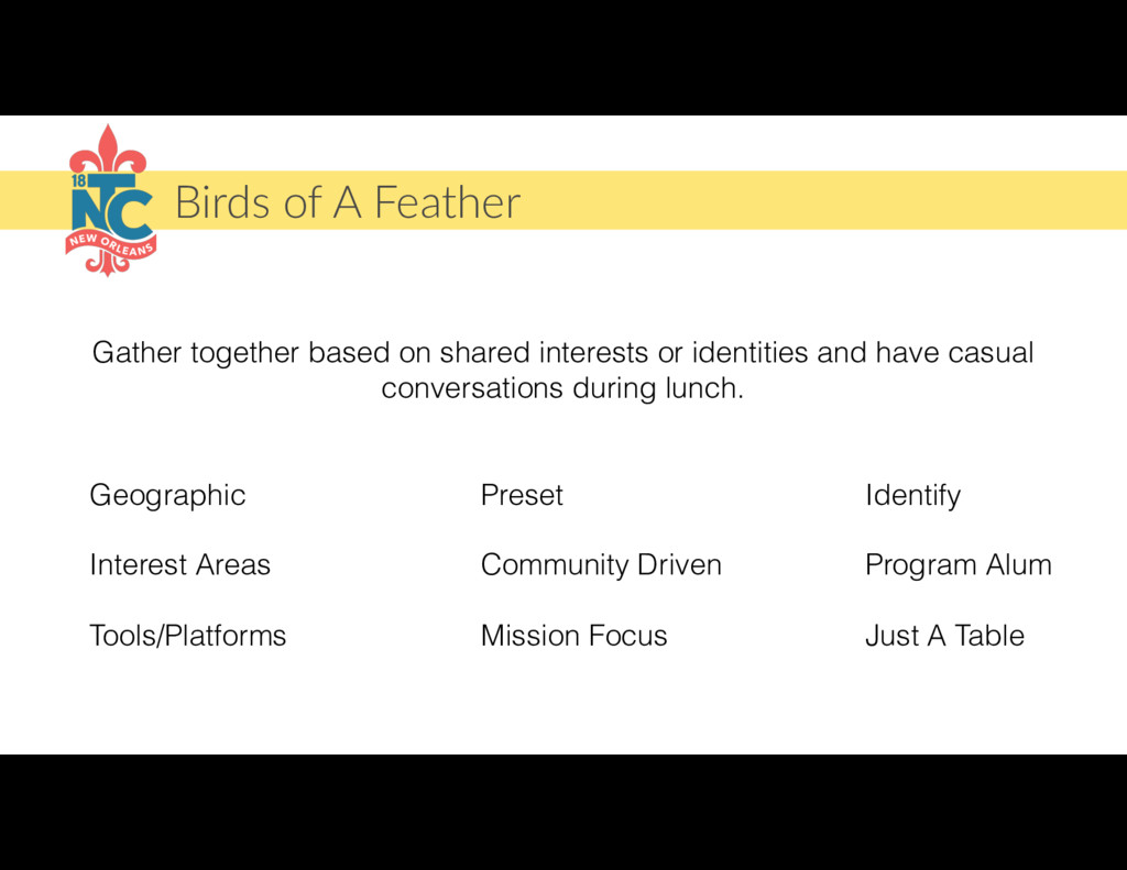 or identities and have casual conversations during lunch. Geographic Interest Areas Tools/Platforms Preset Community Driven Mission Focus Identify Program Alum Just A Table