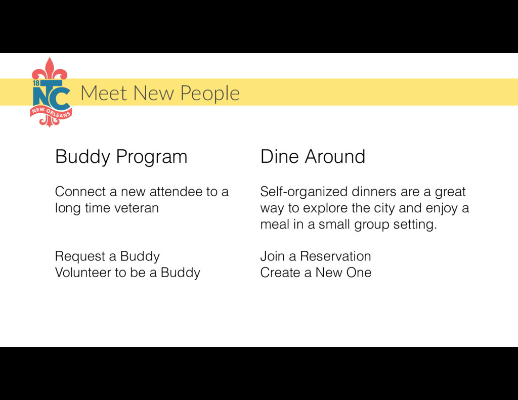a long time veteran Request a Buddy Volunteer to be a Buddy Dine Around Self-organized dinners are a great way to explore the city and enjoy a meal in a small group setting. Join a Reservation Create a New One