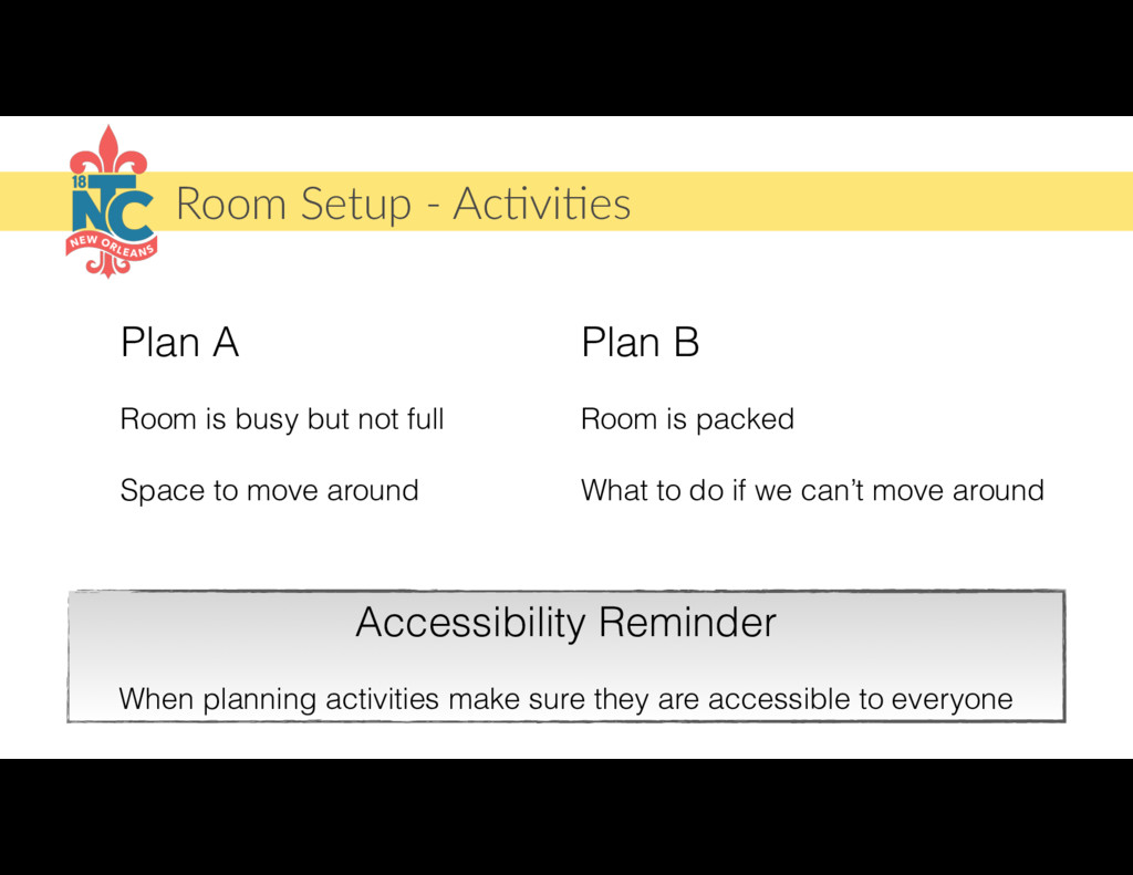 not full Space to move around Plan B Room is packed What to do if we can’t move around Accessibility Reminder When planning activities make sure they are accessible to everyone