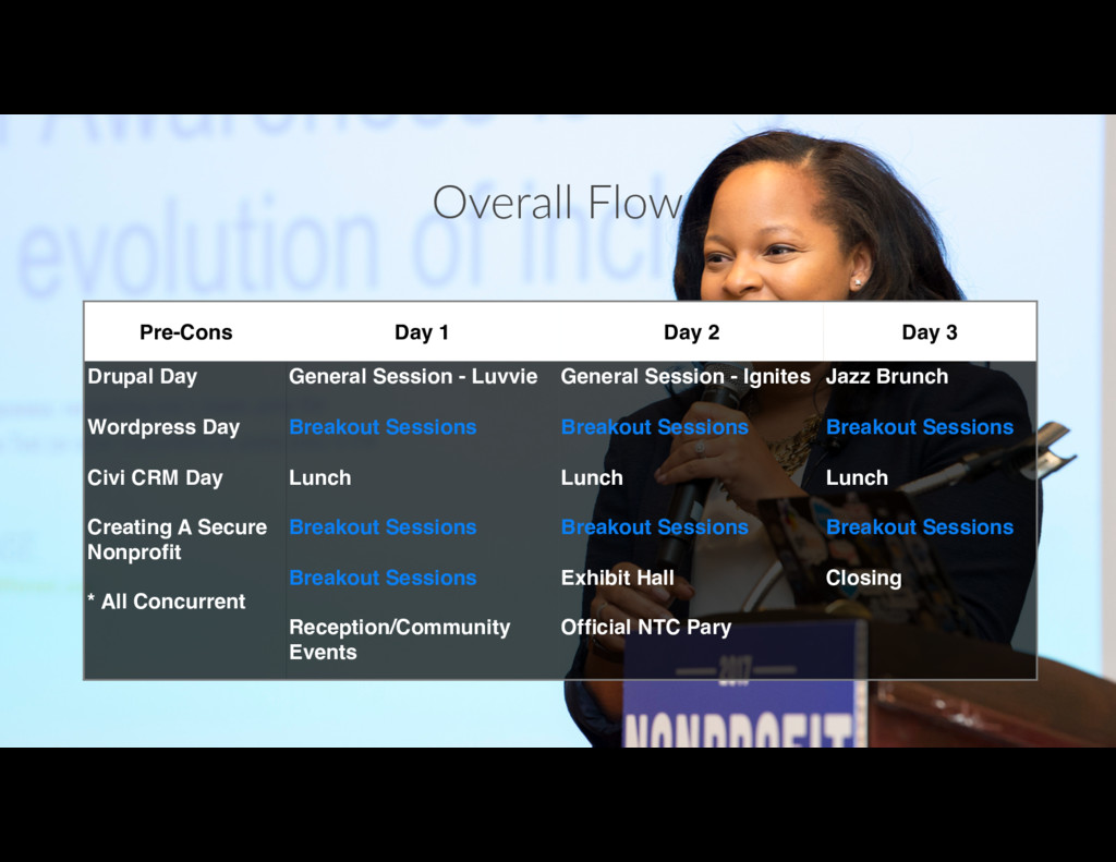 Day Wordpress Day Civi CRM Day Creating A Secure Nonprofit * All Concurrent General Session - Luvvie Breakout Sessions Lunch Breakout Sessions Breakout Sessions Reception/Community Events General Session - Ignites Breakout Sessions Lunch Breakout Sessions Exhibit Hall Official NTC Pary Jazz Brunch Breakout Sessions Lunch Breakout Sessions Closing