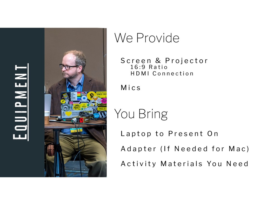 o j e c t o r 1 6 : 9 R a t i o H D M I C o n n e c t i o n M i c s We Provide L a p t o p t o P r e s e n t O n A d a p t e r ( I f N e e d e d f o r M a c ) A c t i v i t y M a t e r i a l s Yo u N e e d You Bring