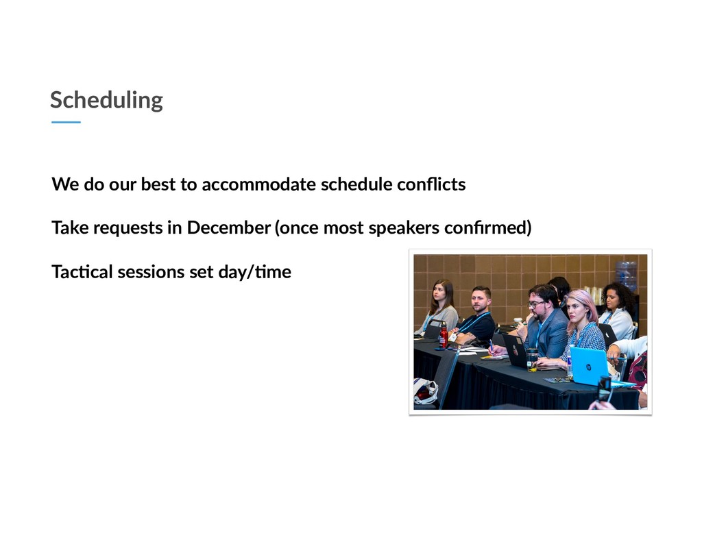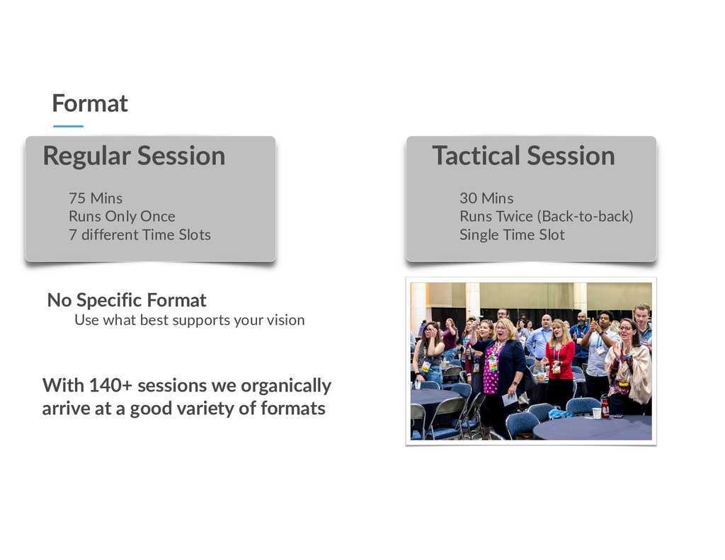 With 140+ sessions we organically arrive at a good variety of formats Regular Session 75 Mins Runs Only Once 7 different Time Slots Tactical Session 30 Mins Runs Twice (Back-to-back) Single Time Slot