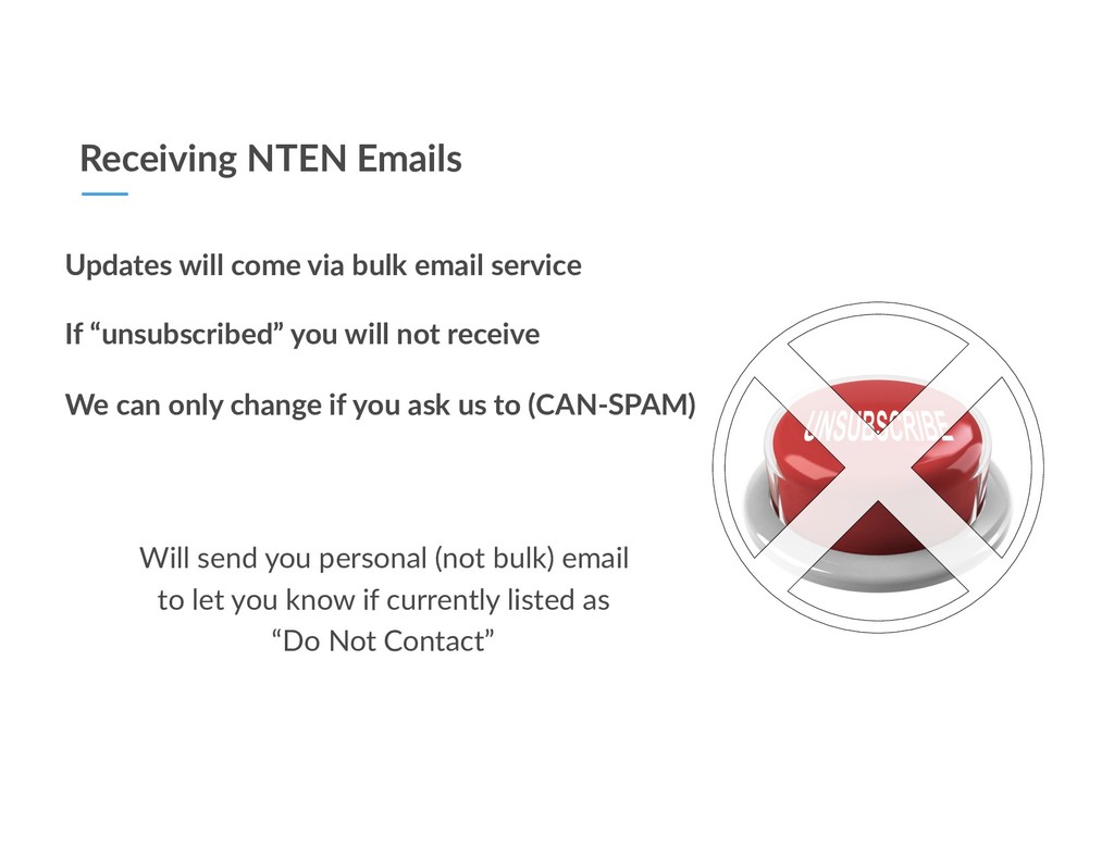 If “unsubscribed” you will not receive We can only change if you ask us to (CAN-SPAM) Will send you personal (not bulk) email to let you know if currently listed as “Do Not Contact”