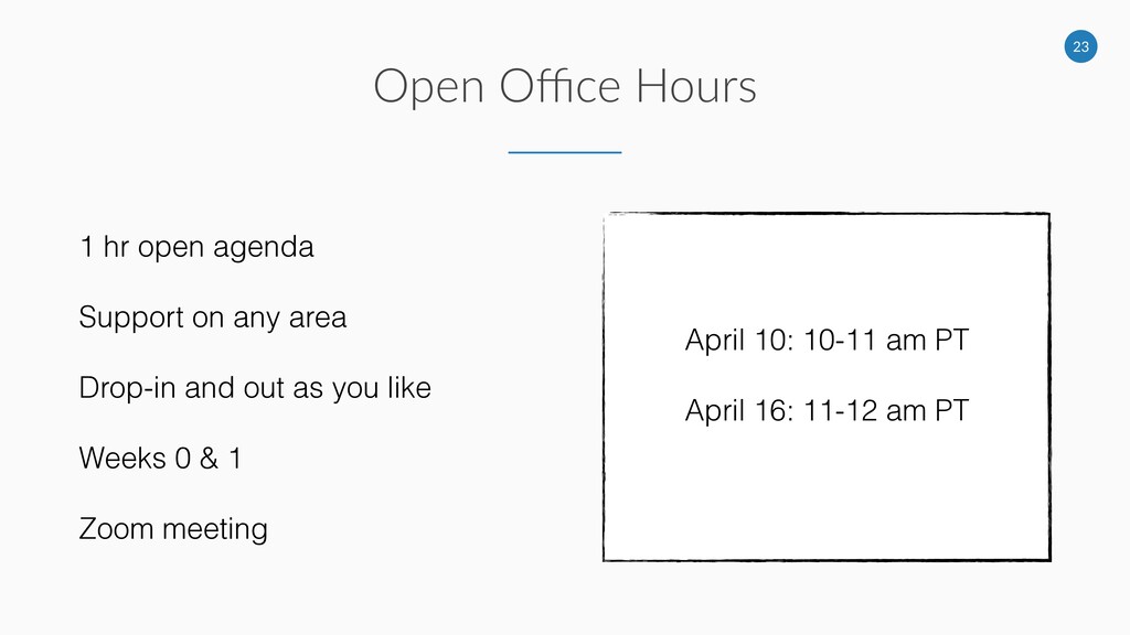 16: 11-12 am PT 1 hr open agenda Support on any area Drop-in and out as you like Weeks 0 & 1 Zoom meeting