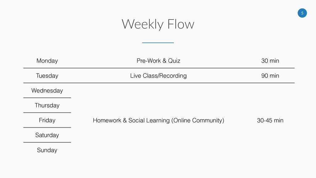Live Class/Recording 90 min Wednesday Homework & Social Learning (Online Community) 30-45 min Thursday Friday Saturday Sunday