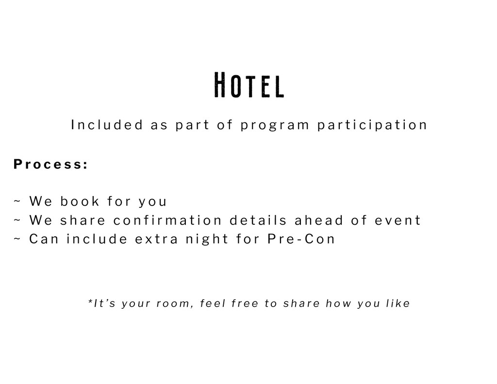 We b o o k f o r y o u ~ We s h a r e c o n f i r m a t i o n d e t a i l s a h e a d o f e v e n t ~ C a n i n c l u d e e x t r a n i g h t f o r P r e - C o n * I t ’ s y o u r r o o m , f e e l f r e e t o s h a r e h o w y o u l i k e I n c l u d e d a s p a r t o f p r o g r a m p a r t i c i p a t i o n