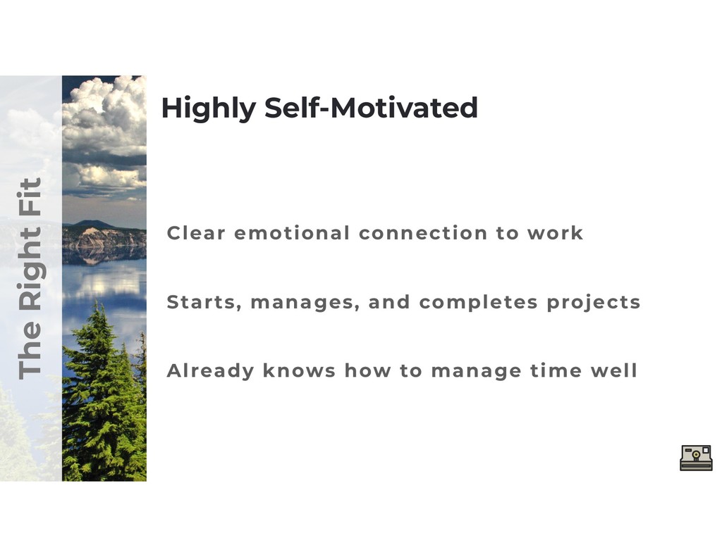 Highly Self-Motivated Clear emotional connection to work Starts, manages, and