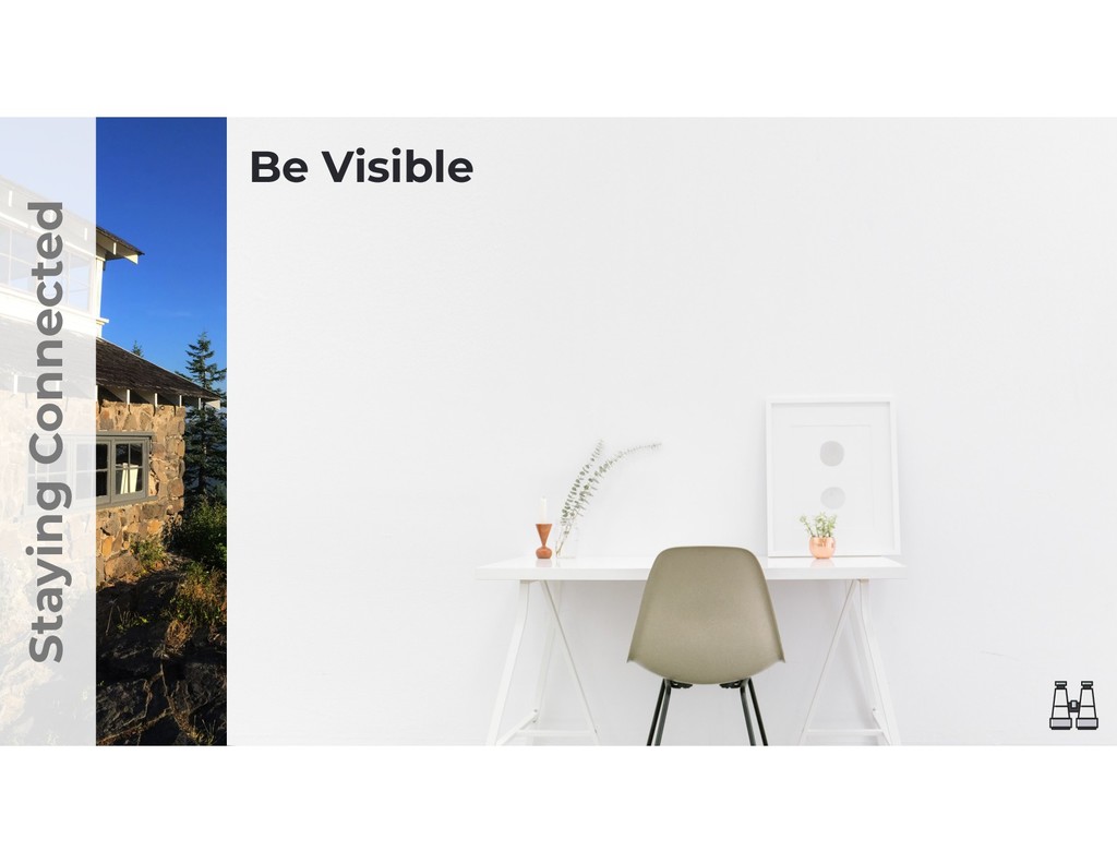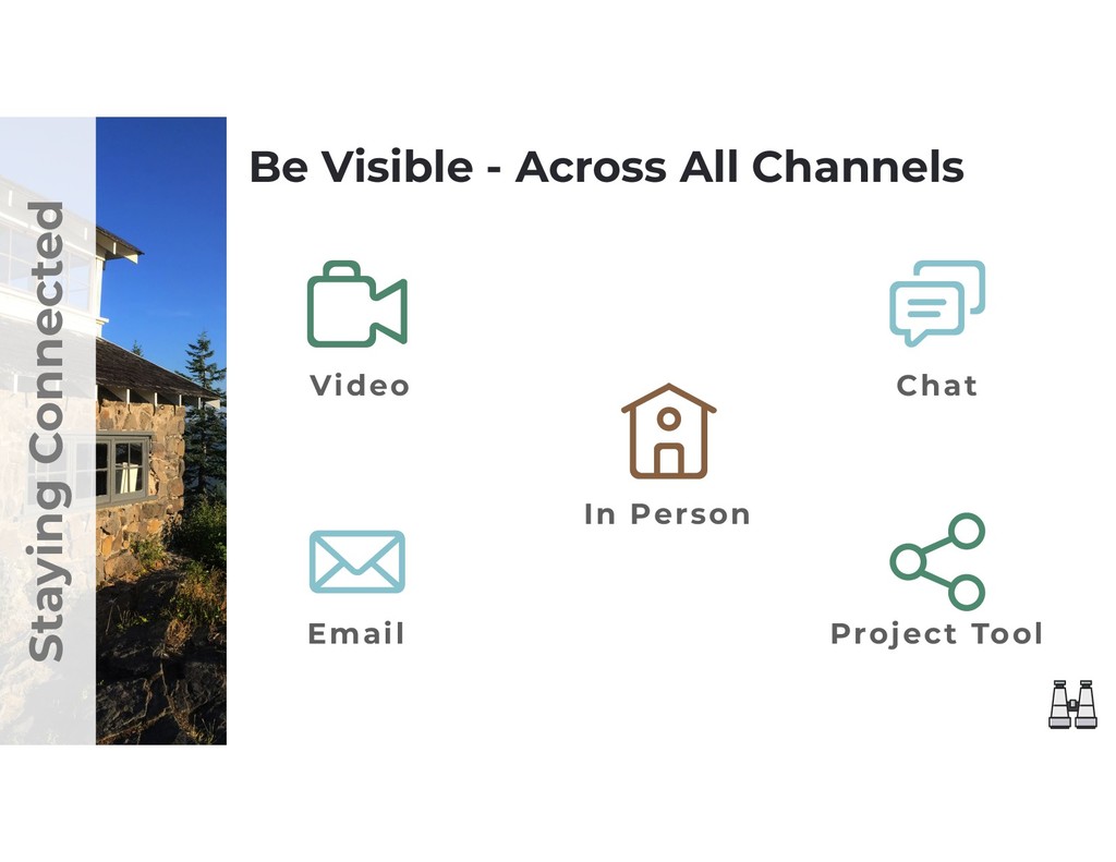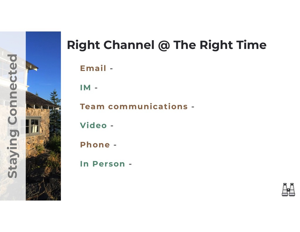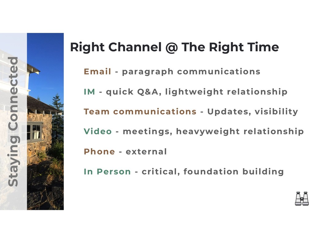 Team communications - Updates, visibility Video - meetings, heavyweight relationship Phone - external In Person - critical, foundation building Right Channel @ The Right Time Staying Connected