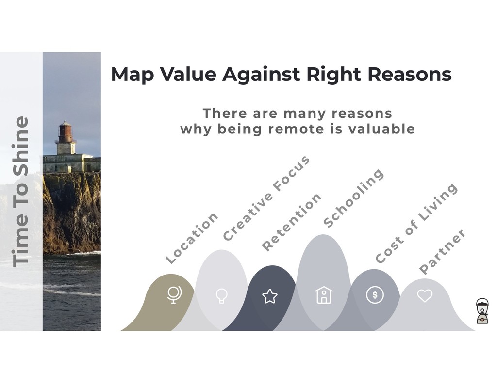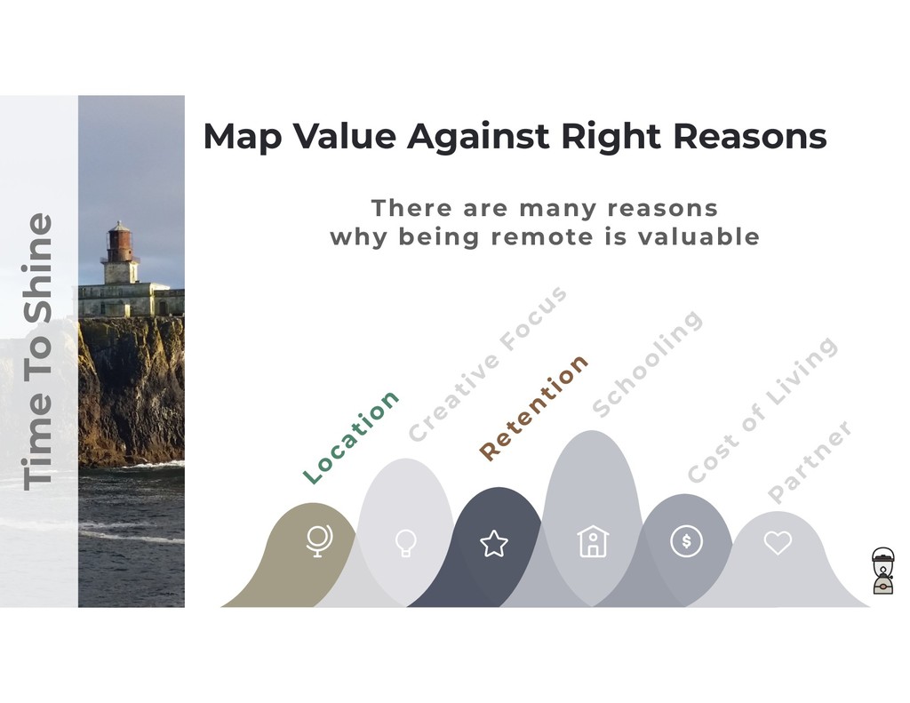 many reasons why being remote is valuable Lo ca tio n C re a tive F o cu s R e te n tio n S ch o o lin g C o st o f Livin g P a rtn e r