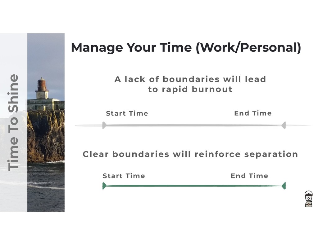 Time A lack of boundaries will lead to rapid burnout Clear boundaries will reinforce separation Start Time End Time