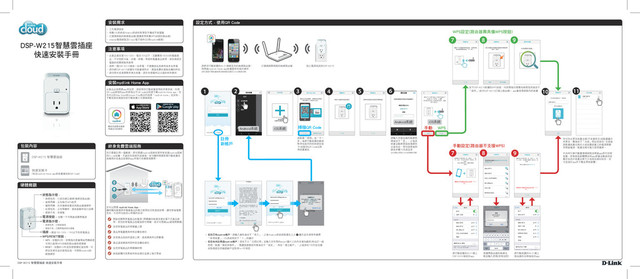 [email protected] 手機付費技術諮詢專線 (02)6600-0123#8715 服務時間:週一至週五 早上9:00-晚上9:00 週六日及國定假日(不含農曆春節) 早上10:00-晚上7:00 用電量結算日: 設定本月某日開始計算30天中的用電量,此日 期的設定變更會反應在前一頁計算30天的用電 量,也可以看作一個30天起始時間的設定 用電量警告通知: 設定當用電量到特定的百分比時發送警告通知 Q3:我要如何註冊並取得3+1年保固? Q4:若忘記mydlink帳戶的密碼時該如何解決? Q2:若無法註冊或搜尋不到裝置時該如何解決? Q1:若要將DSP-W215轉移至其他mydlink帳號(更換Email)時該如何處理? 此產品必須透過mydlink Home app的設定精靈來註冊至mydlink帳 戶,之後系統會發送認證信至您註冊的email信箱,點選認證信內的 連結完成驗證後即可享有3+1年保固。若您沒有收到認證信,請至垃 圾信件匣查看,或改用其他email帳號註冊。 請用電腦開啟網頁瀏覽器,在網址列輸入「http://www.dlink.com」 ,點選登入畫面右下角的「忘記密碼」,輸入您的email後至信箱收 取重設密碼的連結。 • 確認mydlink Home app是否有新版本可供更新 • 依問題1的內容將裝置回復預設值 • 在裝置為預設值時,確認行動裝置的Wi-Fi可否連至DSP-XXXX • 確認裝置在路由器的無線範圍內,或將裝置放置在路由器旁設定 • 確認您選擇的路由器名稱和輸入的密碼正確 • 確認您行動裝置的Wi-Fi已連線至DSP-XXXX,或與DSP-W215連線 至同一台路由器 • 確認您連線的路由器可連通網際網路 • 更換其他行動裝置測試 • 將您裝置的資訊(mydlink號碼與mac位址)提供給客服人員查詢 請按下裝置清單左上方的齒輪圖示進入設定畫面,點選「登出」 再登入/註冊其他mydlink帳戶,之後點選齒輪圖示在選單中點選 「新增裝置」來重新設定。 此手冊僅提供首次安裝參考,實際的mydlink服務內容、app畫面可能會 依版本或韌體版本不同而有差異,若需更多產品相關的檔案或文件,請 至D-Link網站或mydlink網站http://tw.mydlink.com/support下載,也可依以 下資訊聯絡我們。 電磁波曝露量MPE標準值(MPE) 1mW/cm2,送測產品實值為0.032mW/cm2 經型式認證合格之低功率射頻電機,非經許可,公司,商號或使用者均不得擅自變更頻率、加大功率 或變更原設計之特性及功能。低功率射頻電機之使用不得影響飛航安全及干擾合法通信;經發現有干 擾現象時,應立即停用,並改善至無干擾時方得繼續使用。前項合法通信,指依電信法規定作業之無 線電通信。 低功率射頻電機須忍受合法通信或工業、科學及醫療用電波輻射性電機設備之干擾。 請選擇以下其中一種方式將設備回復至預設值,此動作(RESET) 將會把設定清空,並將此裝置從mydlink帳號解除綁定: 1 2 • 軟體RESET - 請至功能選單按下「資訊」再按下 「移除」,之後等待指示燈開始閃爍橘燈 • 硬體RESET - 請按下裝置側邊的WPS按鈕約10 秒,直到狀態指示燈亮起紅燈後再放開,之後等 待指示燈開始閃爍橘燈 行動裝置的用戶可利用D-Link Mobile App來快速查看產品相關訊息。 新增裝置:設定新裝置時 並自動註冊在此mydlink 帳號下,若您要註冊至不 同的帳號時按下「登出」 來重新登入 登出:登出mydlink帳戶 顯示您註冊在此帳戶中的 所有裝置 查看目前app的版本,及 分享至Facebook和Twitter 設定排程時間,之後可 讓裝置選擇排程來使用 基礎規則可讓您執行簡 易的時間設定 進階規則內點選一下可 新增排程進行詳細設定 過熱保護: 請參考家電產品的規格後,滑動溫度的指標來 調整溫度的臨界值。啟用此功能後,在產品超 過設定的溫度時(偵測本機插座溫度)可發送警 告通知並立即斷電以保障您的用電安全 選擇您要使用的排程。排程的時間設定請點選 「我的裝置」清單左上方的 從選單中選擇 「排程」項目,再設定您要的排程。 顯示目前的裝置資訊。您可按下「移除」來將 裝置由此帳戶中移除並回復預設值(解除綁定) 常見問題 技術支援 WPS設定(路由器需具備WPS按鈕) 4 3 5 6 7 8 9 9 手動設定(路由器不支援WPS) 手動 按下DSP-W215側邊的WPS按鈕,待狀態指示燈變為綠燈恆亮後按下「綠色」(表示 DSP-W215已連上路由器),app會搜尋網路內的裝置 iOS系統請點選DSP-W215 Android系統則略過此步驟 iOS系統請點選DSP-W215 Android系統則略過此步驟 iOS系統請點選DSP-W215 Android系統則略過此步驟 請輸入您的mydlink帳號和 密碼,若您未註冊過,請 按下方「立即註冊」來建 立新帳戶,詳細圖示請參 考上一頁 10 11 12 13 10 12 13 14 11 1 2 點選可更改 裝置圖示 點選可更改 裝置名稱 (不支援中文) 開啟/關閉 裝置電源 Android系統 iOS系統 WPS 您可在此更改裝置名稱(不支援中文)或點選圖示來更 改,最後按下「完成」即設定成功! 完成後請點選裝置 名稱右方或按壓裝置上的電源開關來開啟電源,點選 名稱可進入管理選單。 外出時只要行動置連通網路並開啟app即可控管裝置。 若有新版韌體釋出時app將會自動偵測並顯示訊息於 裝置名稱下方或推送通知給您,您可直接於app下載 並更新韌體。 略過 請選擇路由器的無線名 稱並輸入密碼(若有加密) 將行動裝置的Wi-Fi連上 DSP-XXXX後返回app 將行動裝置的Wi-Fi連上 路由器的名稱後返回app 進階設定(選擇性) 設定方式 - 不使用QR Code iOS系統 iOS系統 iOS系統