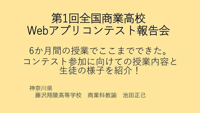 第1回全国商業高校 Webアプリコンテスト報告会 6か月間の授業でここまでできた。 コンテスト参加に向けての授業内容と 生徒の様子を紹介! 神奈川県 藤沢翔陵高等学校 商業科教諭 池田正己
