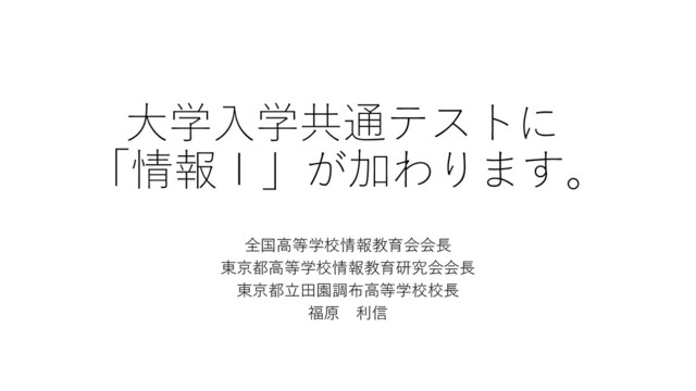 大学入学共通テストに 「情報Ⅰ」が加わります。 全国高等学校情報教育会会長 東京都高等学校情報教育研究会会長 東京都立田園調布高等学校校長 福原 利信