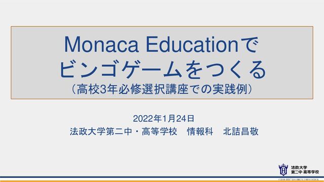 Monaca Educationで ビンゴゲームをつくる (高校3年必修選択講座での実践例) 2022年1月24日 法政大学第二中・高等学校 情報科 北詰昌敬
