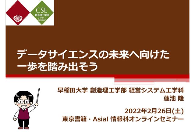 データサイエンスの未来へ向けた ⼀歩を踏み出そう 早稲⽥⼤学 創造理⼯学部 経営システム⼯学科 蓮池 隆 2022年2⽉26⽇(⼟) 東京書籍・Asial 情報科オンラインセミナー
