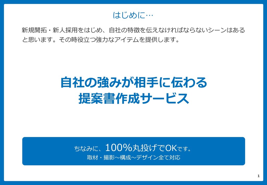 はじめに… 1 新規開拓・新⼈採⽤をはじめ、⾃社の特徴を伝えなければならないシーンはある と思います。その時役⽴つ強⼒なアイテムを提供します。 ⾃社の強みが相⼿に伝わる 提案書作成サービス ちなみに、100%丸投げでOKです。 取材・撮影〜構成〜デザイン全て対応