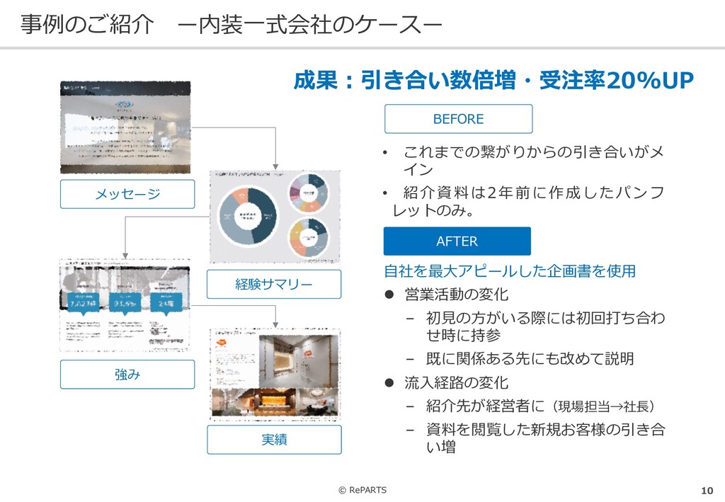 AFTER • これまでの繋がりからの引き合いがメ イン • 紹介資料は2年前に作成したパンフ レットのみ。 ⾃社を最⼤アピールした企画書を使⽤ l 営業活動の変化 – 初⾒の⽅がいる際には初回打ち合わ せ時に持参 – 既に関係ある先にも改めて説明 l 流⼊経路の変化 – 紹介先が経営者に(現場担当→社⻑) – 資料を閲覧した新規お客様の引き合 い増 成果︓引き合い数倍増・受注率20%UP
