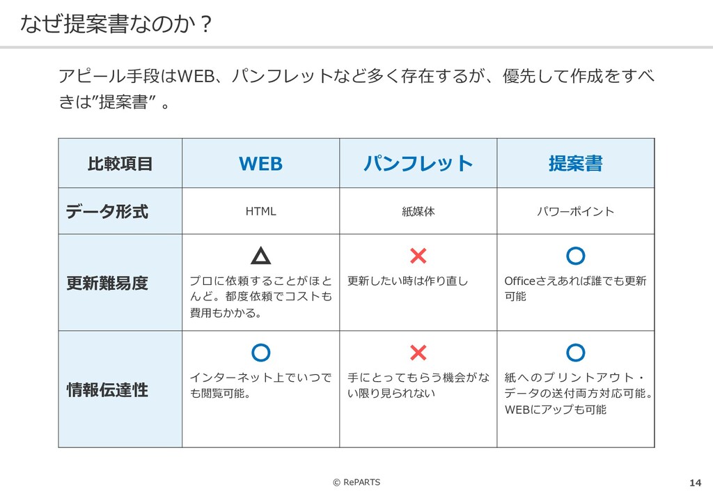 © RePARTS なぜ提案書なのか︖ 14 アピール⼿段はWEB、パンフレットなど多く存在するが、優先して作成をすべ きは”提案書” 。 ⽐較項⽬ WEB パンフレット
