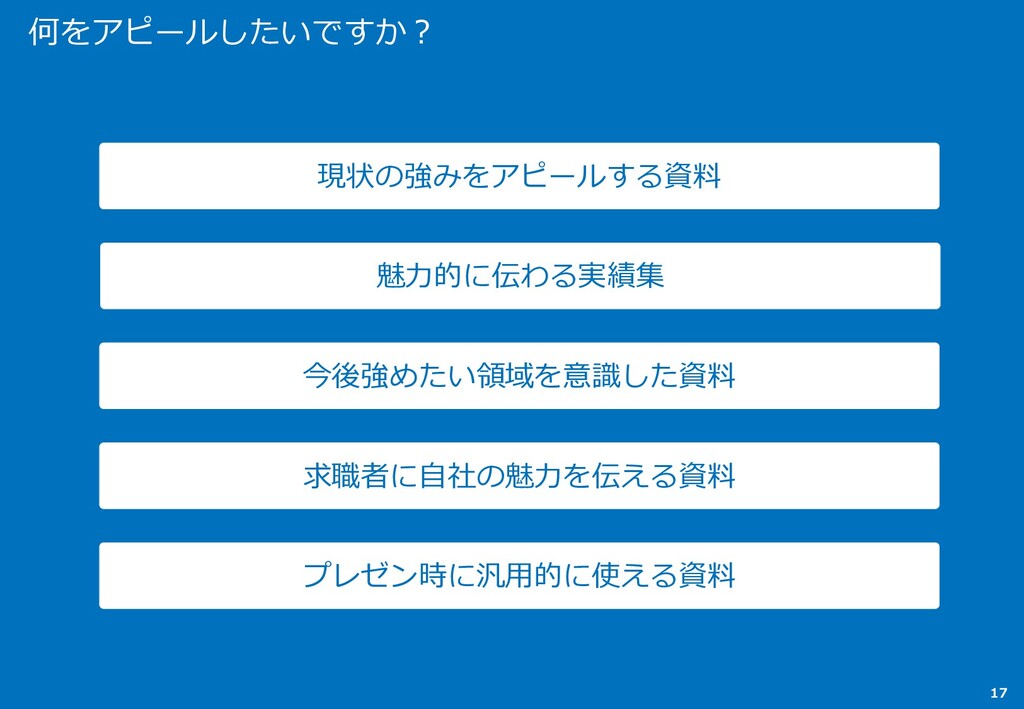 何をアピールしたいですか︖ 17 現状の強みをアピールする資料 今後強めたい領域を意識した資料 求職者に⾃社の魅⼒を伝える資料 プレゼン時に汎⽤的に使える資料 魅⼒的に伝わる実績集