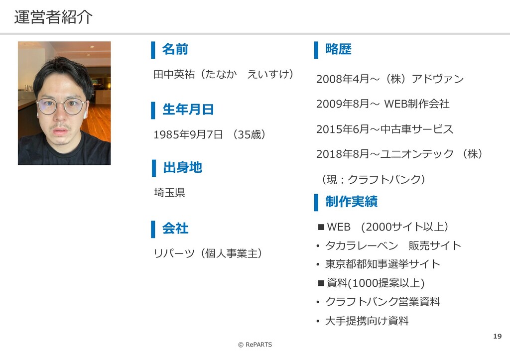 © RePARTS 運営者紹介 19 名前 ⽥中英祐(たなか えいすけ) 出⾝地 埼⽟県 ⽣年⽉⽇