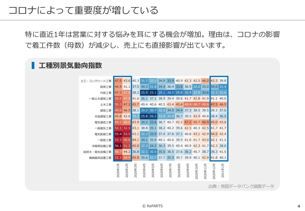 © RePARTS コロナによって重要度が増している 4 特に直近1年は営業に対する悩みを⽿にする機会が増加。理由は、コロナの影響 で着⼯件数(⺟数)が減少し、売上にも直接影響が出ています。 出典︓帝国データバンク調査データ ▍⼯種別景気動向指数