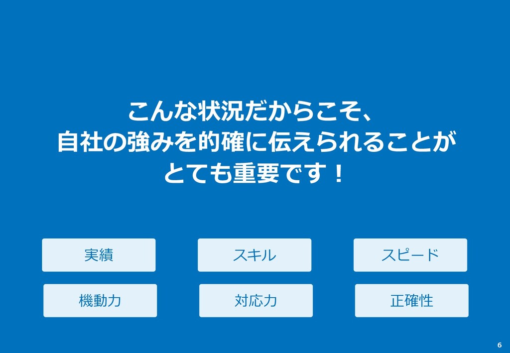 6 こんな状況だからこそ、 ⾃社の強みを的確に伝えられることが とても重要です︕ 実績 スキル スピード 機動⼒ 対応⼒ 正確性