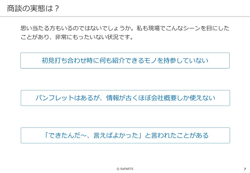 © RePARTS 商談の実態は︖ 7 思い当たる⽅もいるのではないでしょうか。私も現場でこんなシーンを⽬にした ことがあり、⾮常にもったいない状況です。 初⾒打ち合わせ時に何も紹介できるモノを持参していない パンフレットはあるが、情報が古くほぼ会社概要しか使えない 「できたんだ〜、⾔えばよかった」と⾔われたことがある