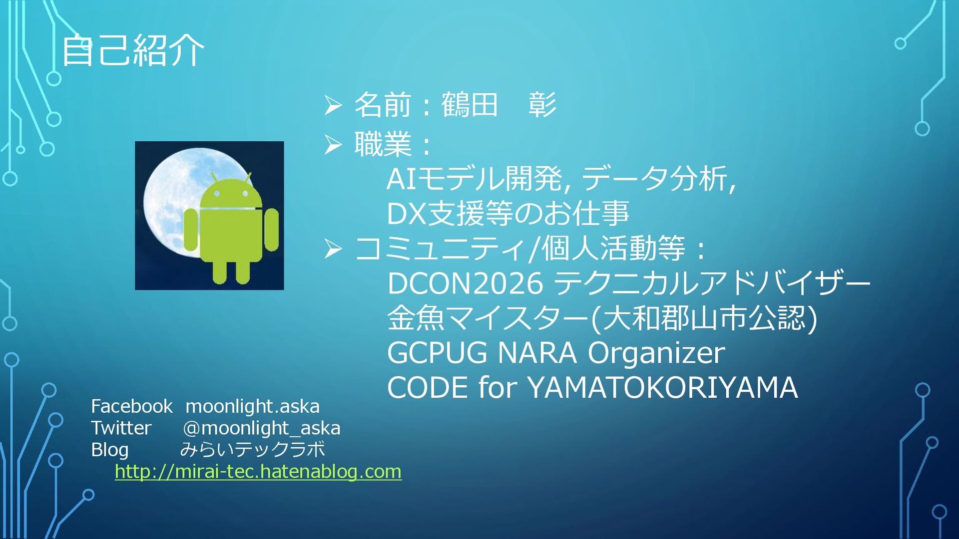自己紹介 Facebook moonlight.aska Twitter @moonlight_aska Blog みらいテックラボ http://mirai-tec.hatenablog.com ➢ 名前:鶴田