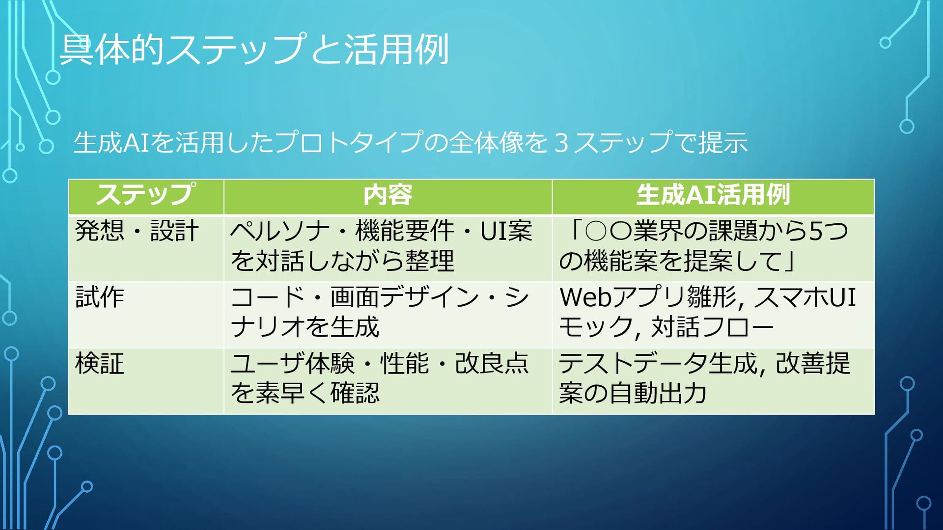 コード・画面デザイン・シ ナリオを生成 Webアプリ雛形, スマホUI モック, 対話フロー 検証 ユーザ体験・性能・改良点 を素早く確認 テストデータ生成, 改善提 案の自動出力 生成AIを活用したプロトタイプの全体像を3ステップで提示