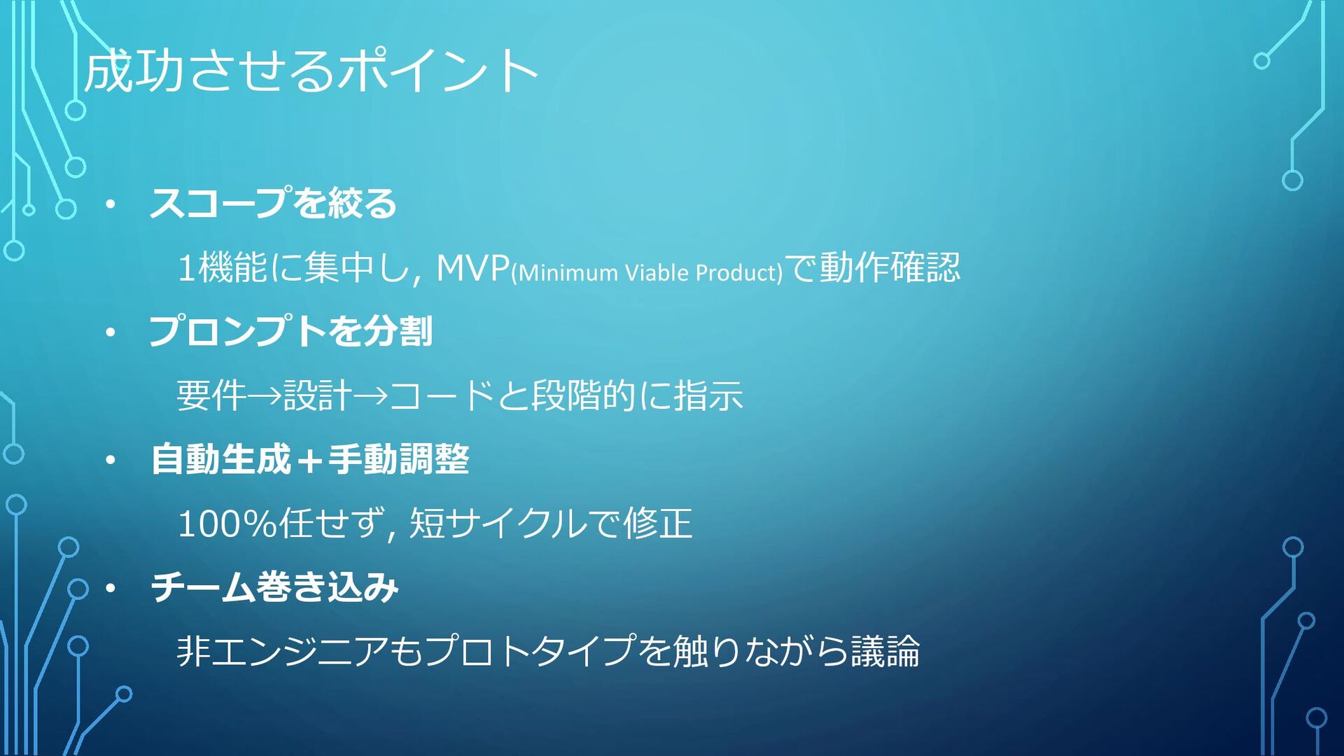 成功させるポイント • スコープを絞る 1機能に集中し, MVP(Minimum Viable Product)で動作確認 • プロンプトを分割 要件→設計→コードと段階的に指示