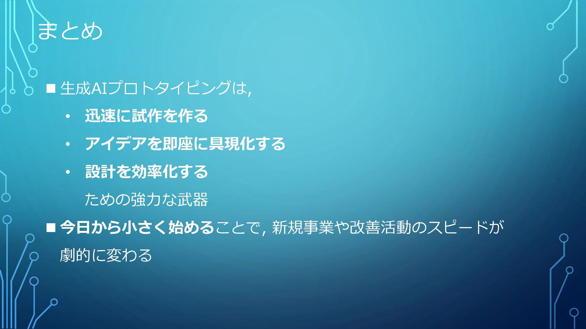まとめ ◼ 生成AIプロトタイピングは, • 迅速に試作を作る • アイデアを即座に具現化する • 設計を効率化する ための強力な武器
