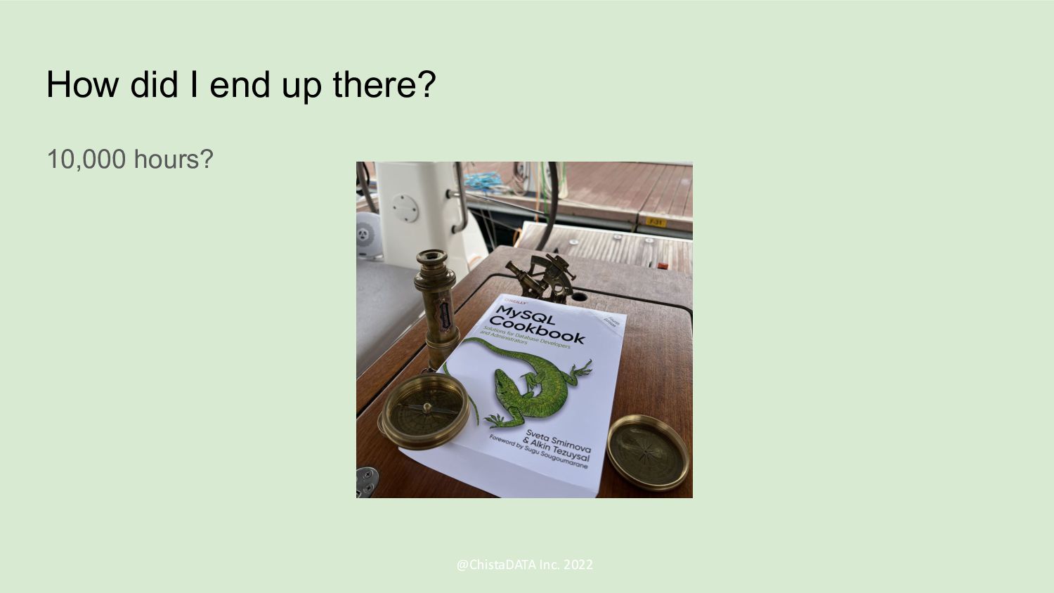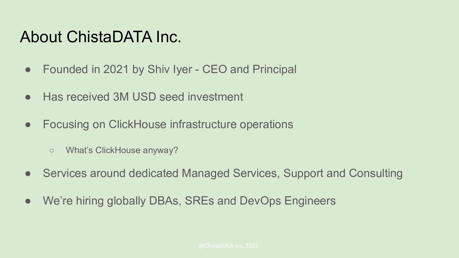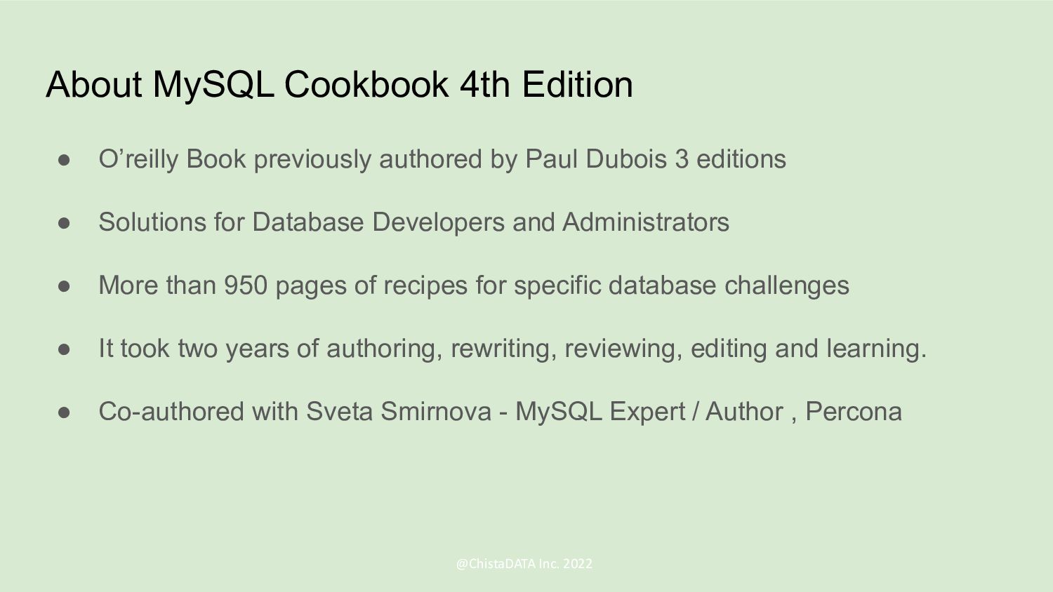 EVP - Global Services @chistadata ◦ Linkedin : https://www.linkedin.com/in/askdba/ ◦ Twitter: https://twitter.com/ask_dba • Open Source Database Evangelist ◦ Previously PlanetScale, Percona and Pythian as Technical Manager, SRE, DBA ◦ Previously Enterprise DBA , Informix, Oracle, DB2 , SQL Server • Author, Speaker, Mentor, and Coach @ChistaDATA Inc. 2022