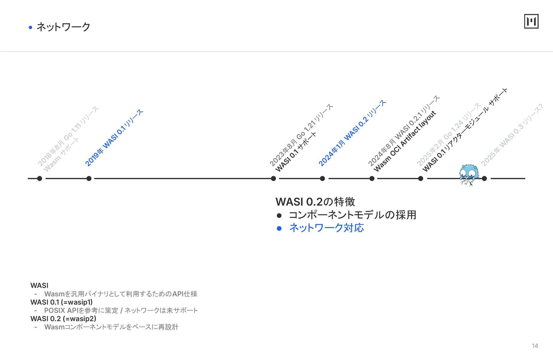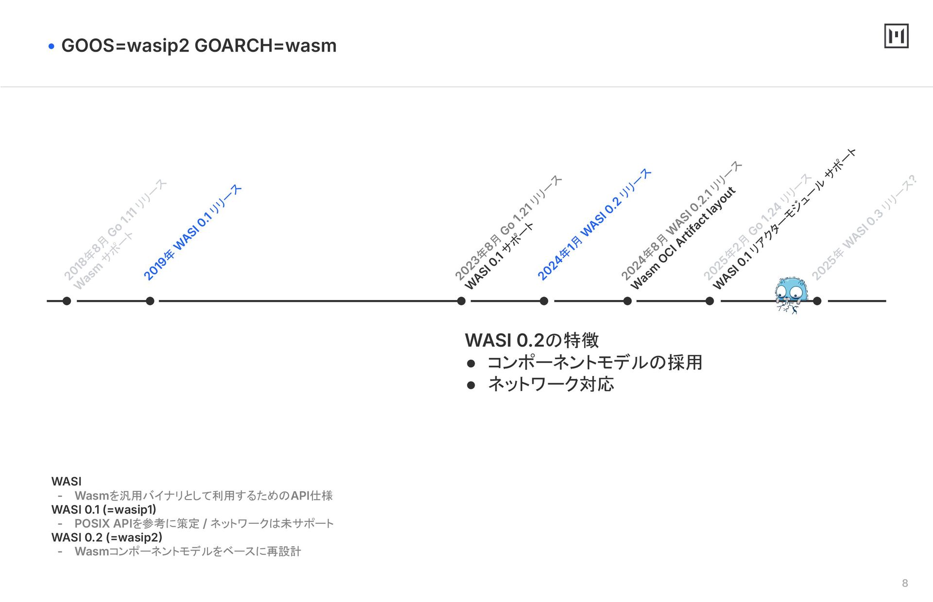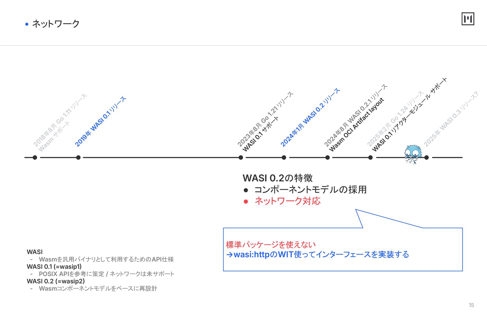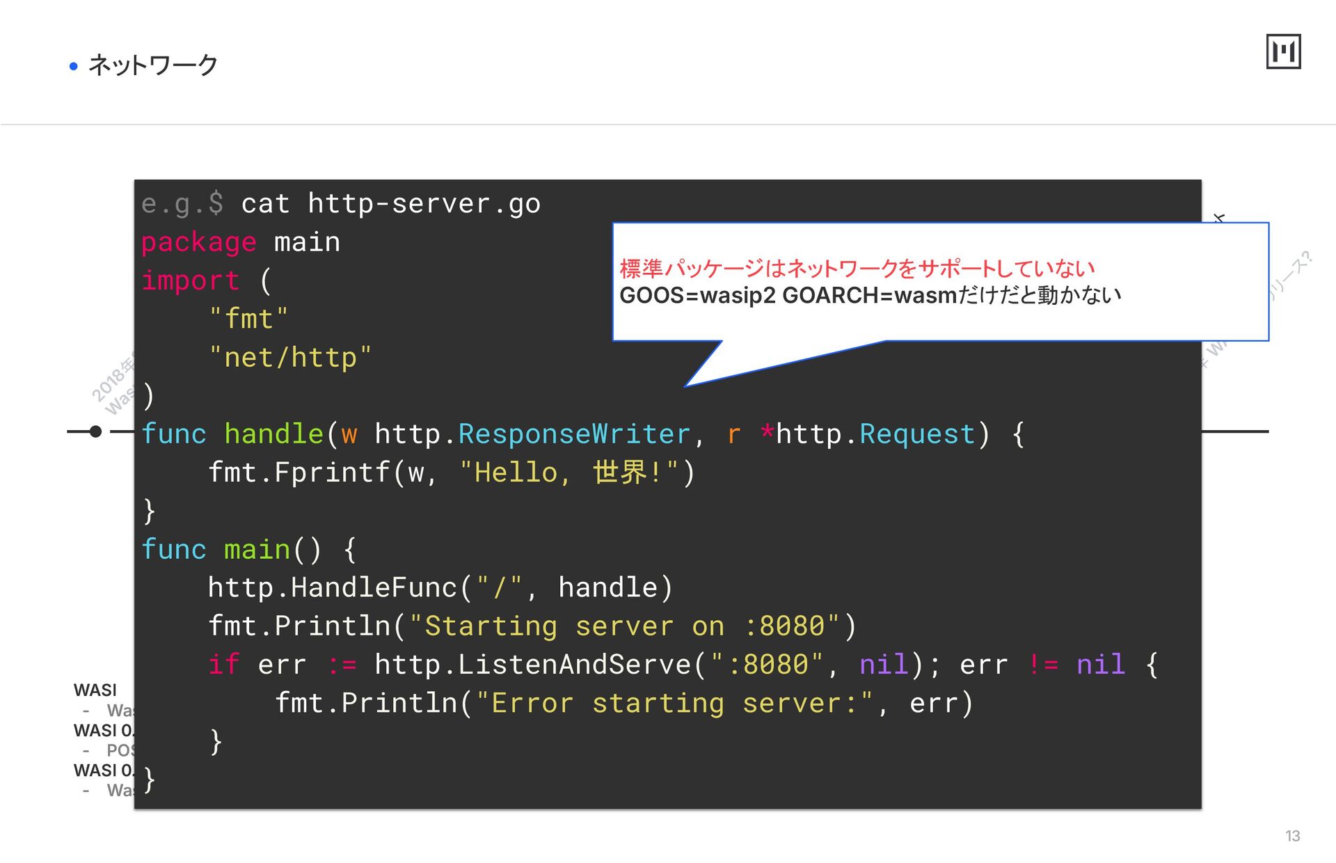 Wasmを汎用バイナリとして利用するためのAPI仕様 WASI 0.1 (=wasip1 - POSIX APIを参考に策定 / ネットワークは未サポート WASI 0.2 (=wasip2 - Wasmコンポーネントモデルをベースに再設計 2018年 8月 G o 1.11 リ リ ー ス W asm サ ポ ー ト 2019年 W A SI 0.1 リ リ ー ス 2023年 8月 G o 1.21 リ リ ー ス W A SI 0.1 サ ポ ー ト 2024年 1月 W A SI 0.2 リ リ ー ス 2024年 8月 W A SI 0.2.1 リ リ ー ス W asm O C I A rtifact layout 2025年 W A SI 0.3 リ リ ー ス ? 2025年 2月 G o 1.24 リ リ ー ス W A SI 0.1 リ ア ク タ ー モ ジ ュ ー ル サ ポ ー ト e.g.$ cat http-server.go package main import ( "fmt" "net/http" ) func handle(w http.ResponseWriter, r *http.Request) { fmt.Fprintf(w, "Hello, 世界!") } func main() { http.HandleFunc("/", handle) fmt.Println("Starting server on :8080") if err := http.ListenAndServe(":8080", nil); err != nil { fmt.Println("Error starting server:", err) } } 標準パッケージはネットワークをサポートしていない GOOS=wasip2 GOARCH=wasmだけだと動かない