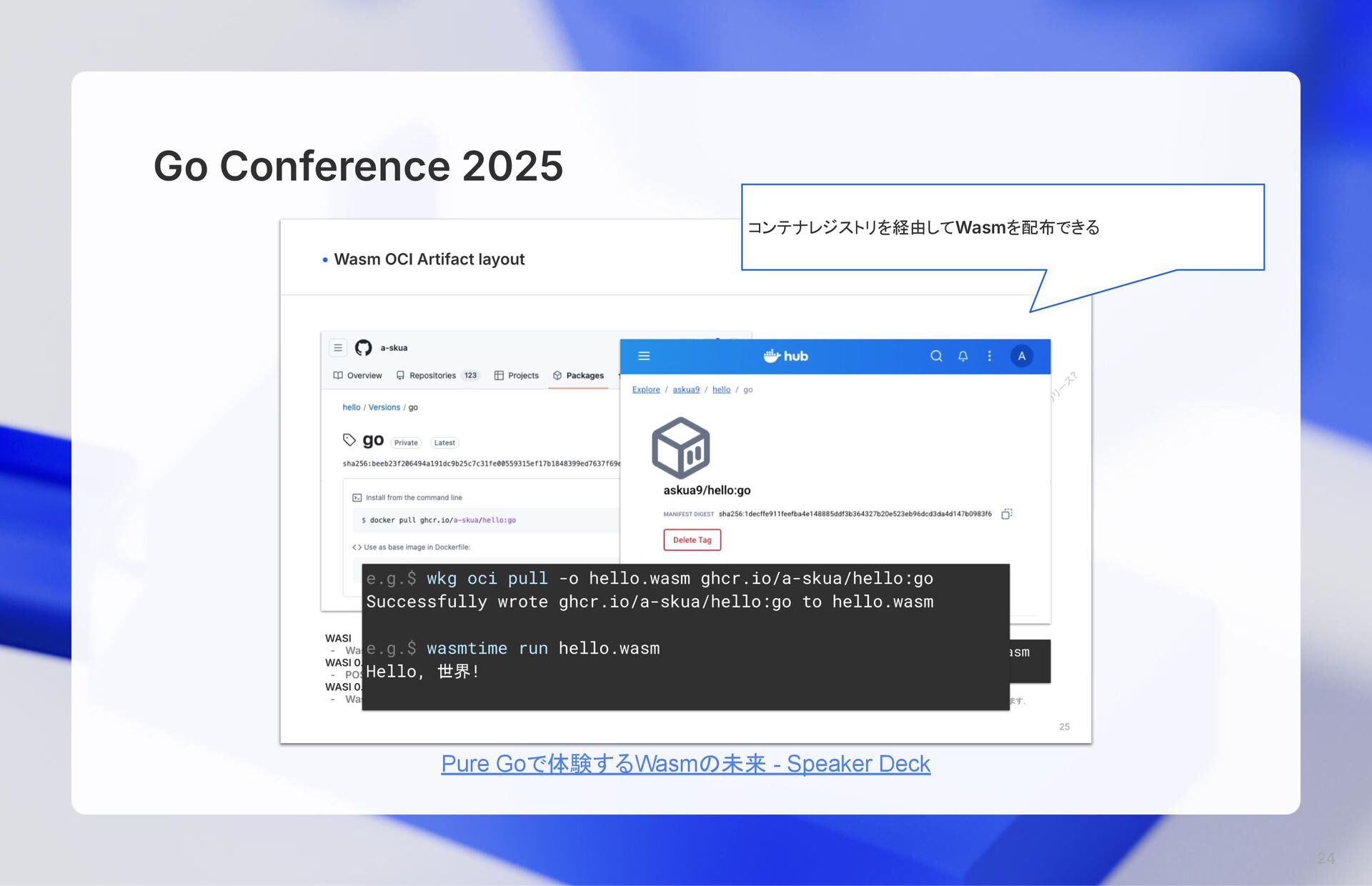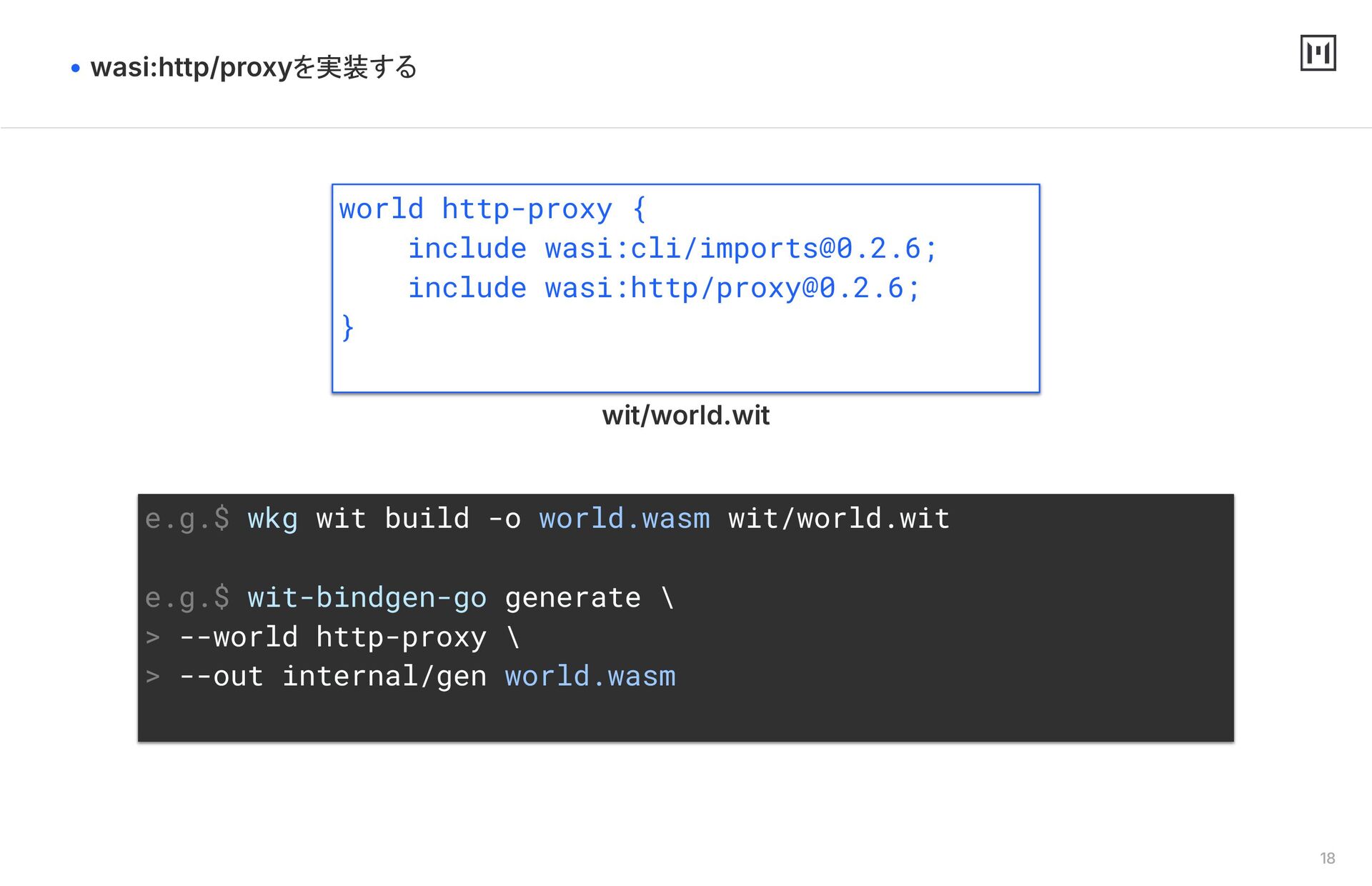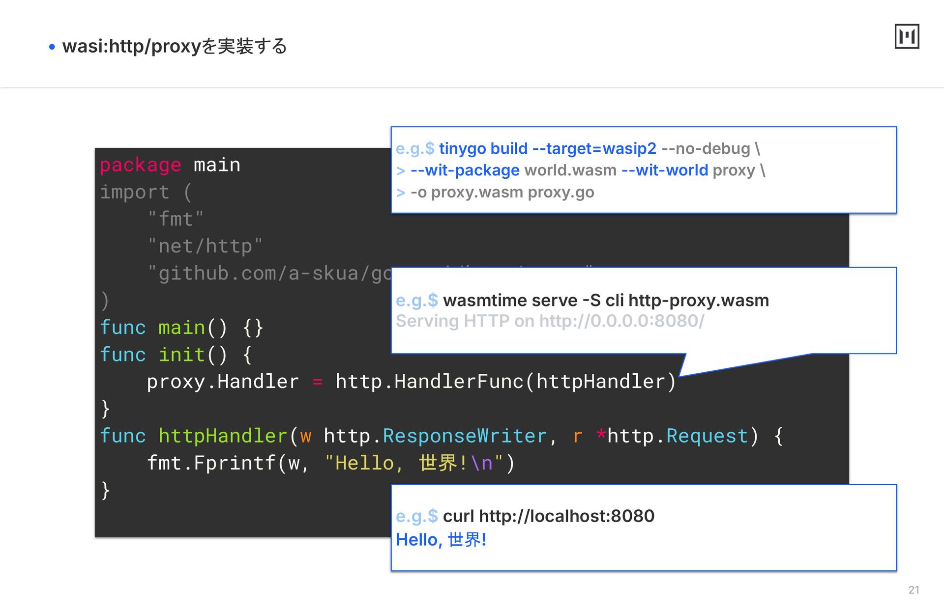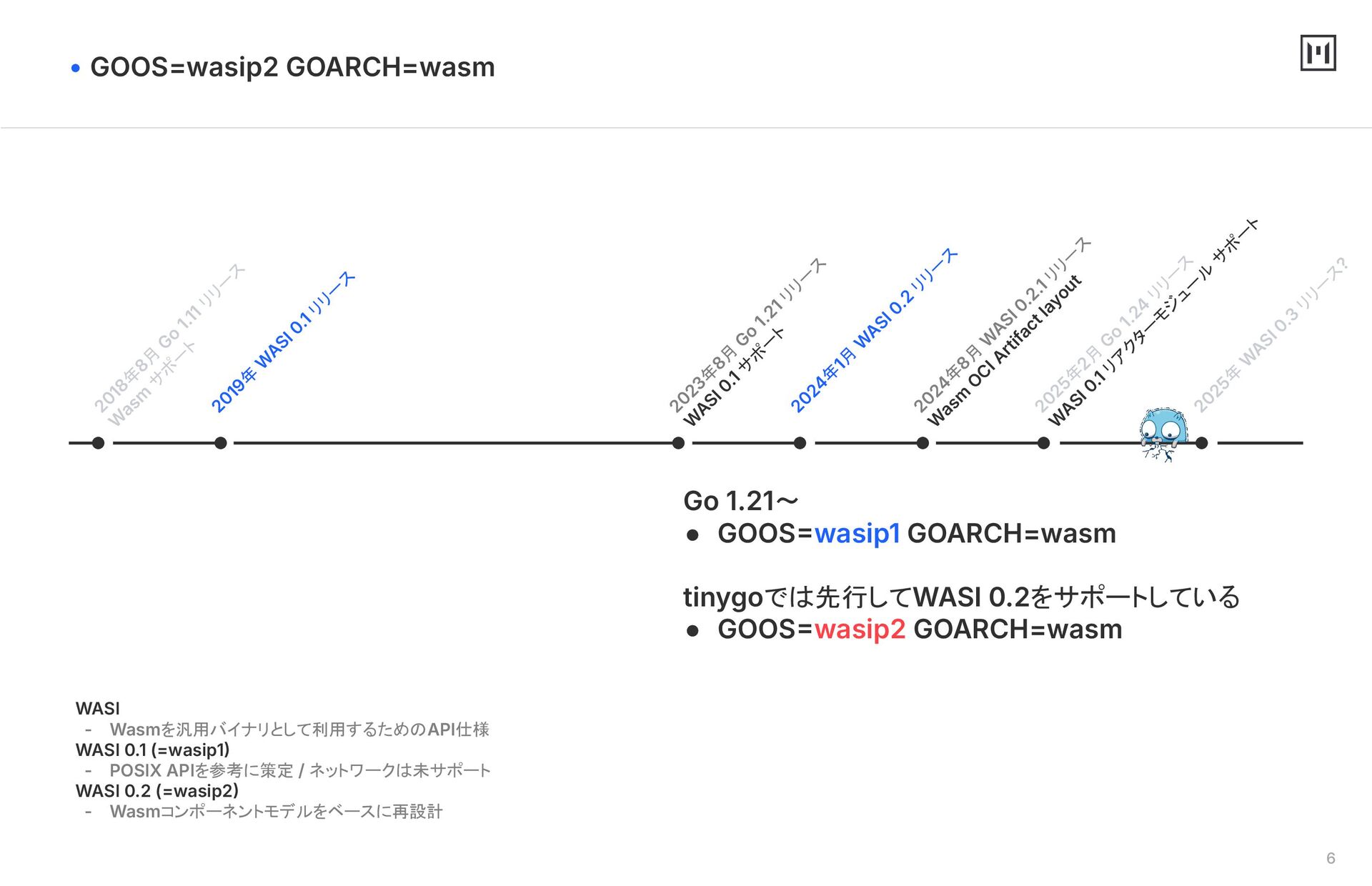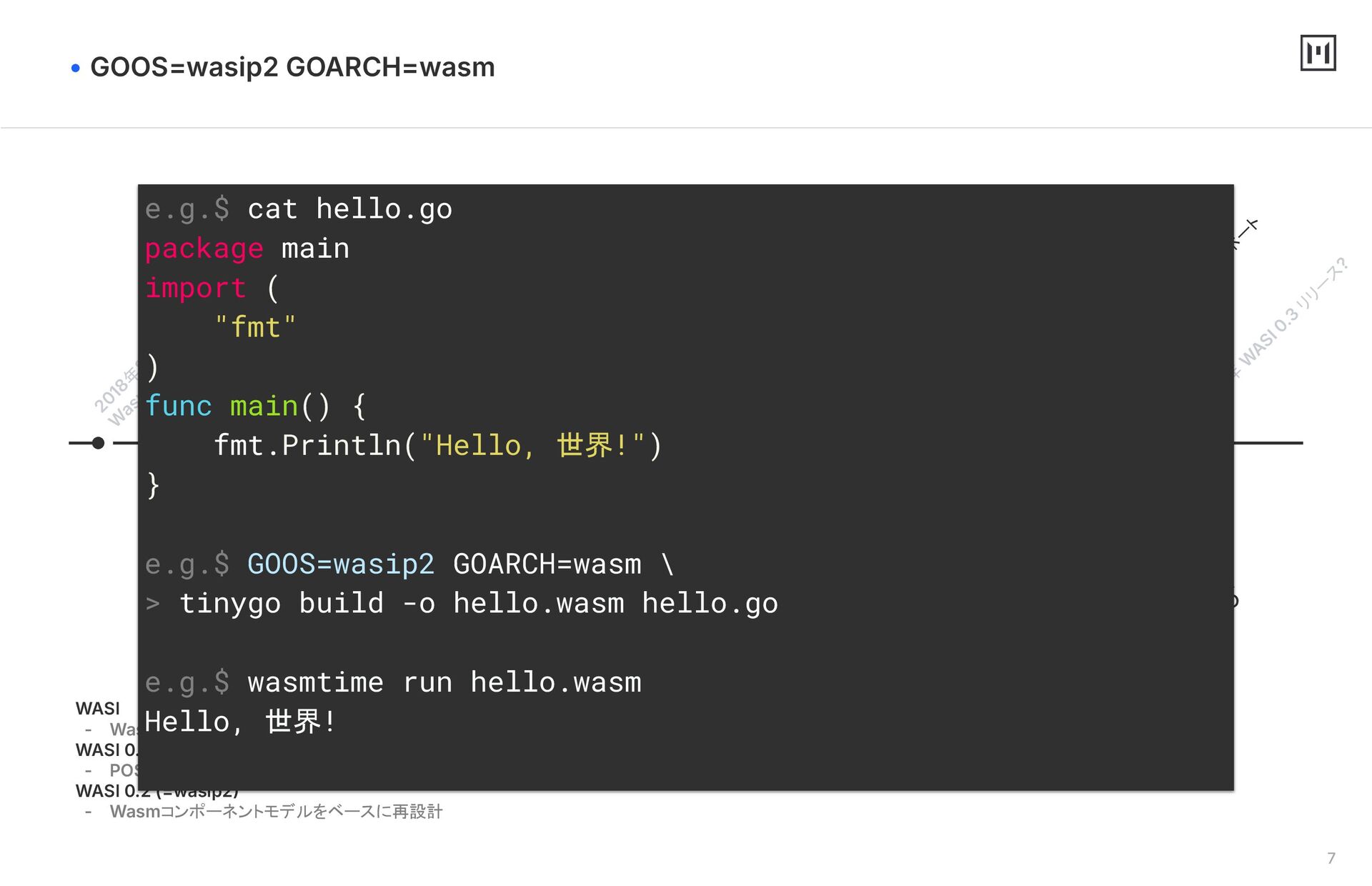 Wasmを汎用バイナリとして利用するためのAPI仕様 WASI 0.1 (=wasip1 - POSIX APIを参考に策定 / ネットワークは未サポート WASI 0.2 (=wasip2 - Wasmコンポーネントモデルをベースに再設計 2018年 8月 G o 1.11 リ リ ー ス W asm サ ポ ー ト 2019年 W A SI 0.1 リ リ ー ス 2023年 8月 G o 1.21 リ リ ー ス W A SI 0.1 サ ポ ー ト 2024年 1月 W A SI 0.2 リ リ ー ス 2024年 8月 W A SI 0.2.1 リ リ ー ス W asm O C I A rtifact layout 2025年 W A SI 0.3 リ リ ー ス ? 2025年 2月 G o 1.24 リ リ ー ス W A SI 0.1 リ ア ク タ ー モ ジ ュ ー ル サ ポ ー ト e.g.$ cat http-server.go package main import ( "fmt" "net/http" ) func handle(w http.ResponseWriter, r *http.Request) { fmt.Fprintf(w, "Hello, 世界!") } func main() { http.HandleFunc("/", handle) fmt.Println("Starting server on :8080") if err := http.ListenAndServe(":8080", nil); err != nil { fmt.Println("Error starting server:", err) } } 標準パッケージはネットワークをサポートしていない GOOS=wasip2 GOARCH=wasmだけだと動かない