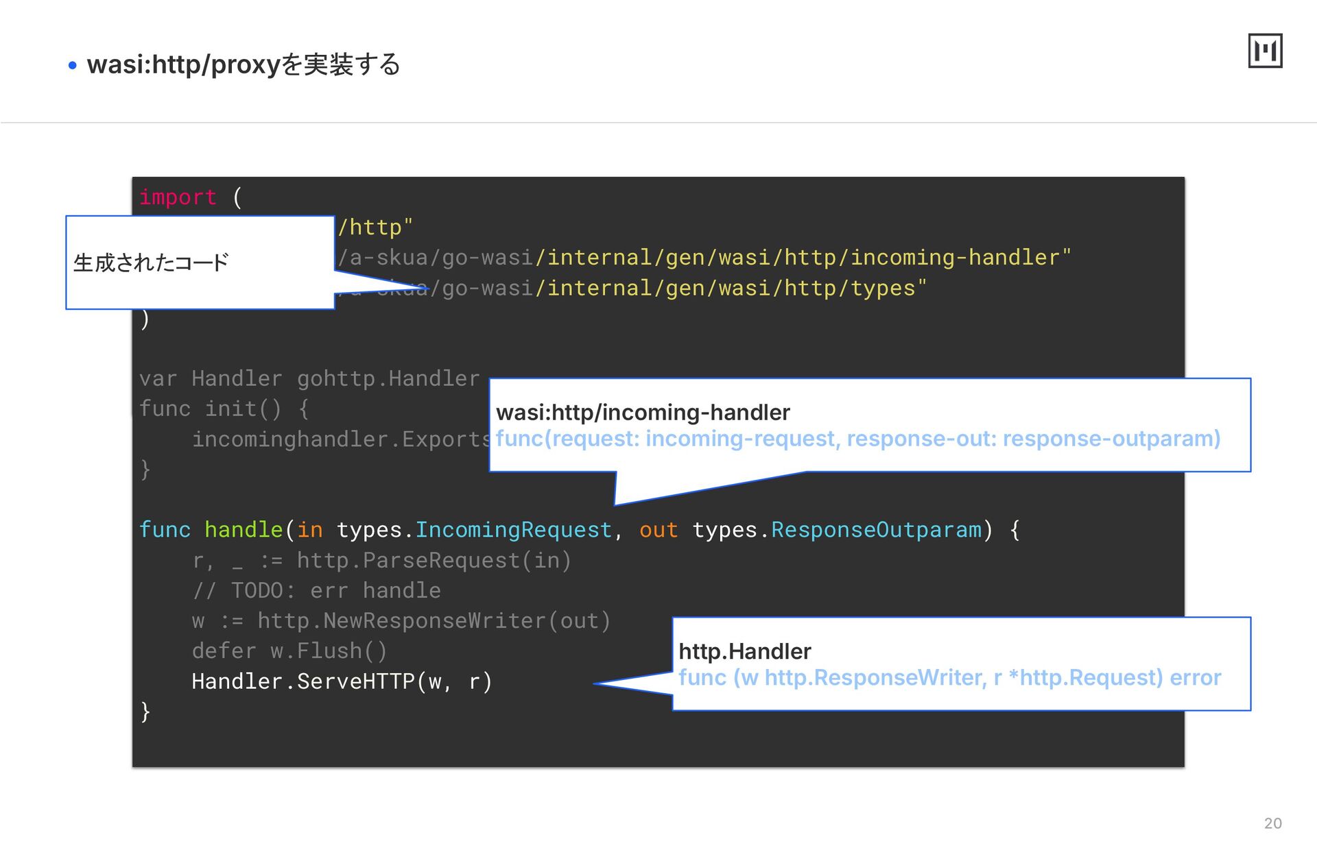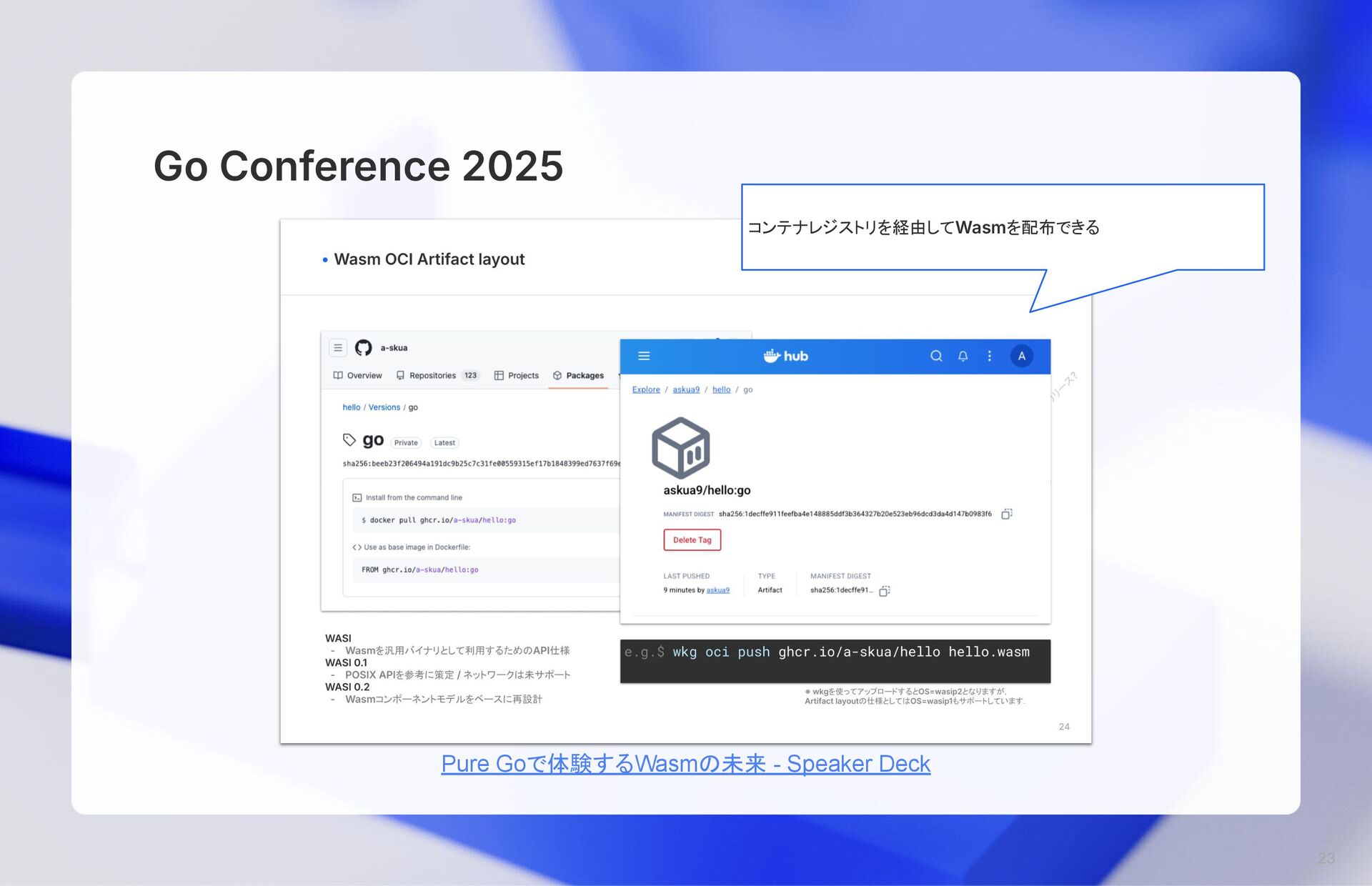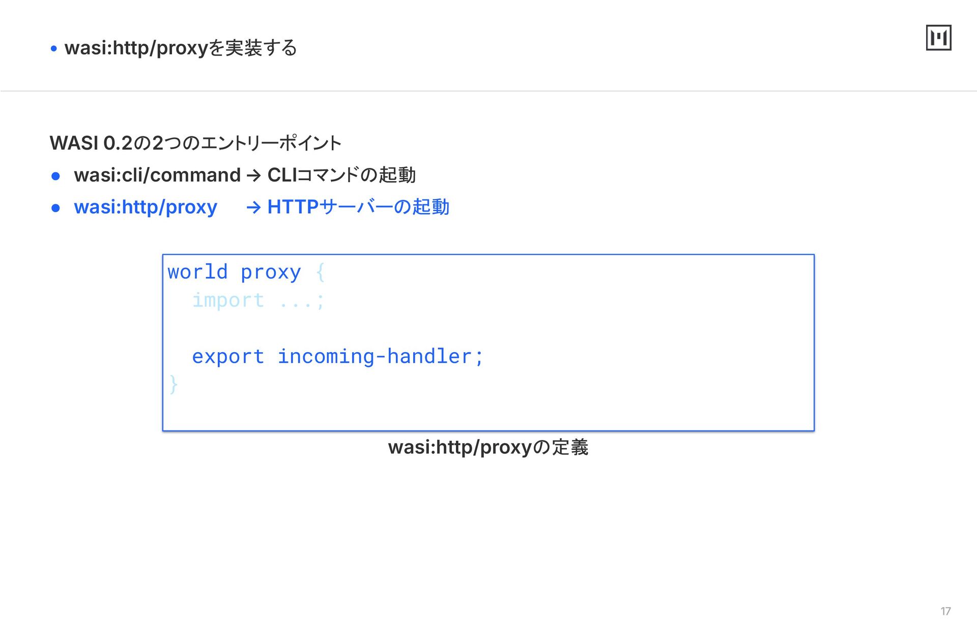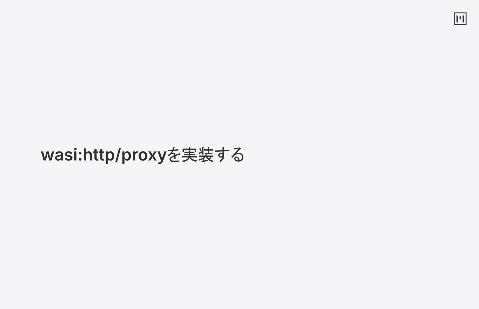 Wasmを汎用バイナリとして利用するためのAPI仕様 WASI 0.1 (=wasip1 - POSIX APIを参考に策定 / ネットワークは未サポート WASI 0.2 (=wasip2 - Wasmコンポーネントモデルをベースに再設計 2018年 8月 G o 1.11 リ リ ー ス W asm サ ポ ー ト 2019年 W A SI 0.1 リ リ ー ス 2023年 8月 G o 1.21 リ リ ー ス W A SI 0.1 サ ポ ー ト 2024年 1月 W A SI 0.2 リ リ ー ス 2024年 8月 W A SI 0.2.1 リ リ ー ス W asm O C I A rtifact layout 2025年 W A SI 0.3 リ リ ー ス ? 2025年 2月 G o 1.24 リ リ ー ス W A SI 0.1 リ ア ク タ ー モ ジ ュ ー ル サ ポ ー ト e.g.$ cat http-server.go package main import ( "fmt" "net/http" ) func handle(w http.ResponseWriter, r *http.Request) { fmt.Fprintf(w, "Hello, 世界!") } func main() { http.HandleFunc("/", handle) fmt.Println("Starting server on :8080") if err := http.ListenAndServe(":8080", nil); err != nil { fmt.Println("Error starting server:", err) } } 標準パッケージはネットワークをサポートしていない GOOS=wasip2 GOARCH=wasmだけだと動かない