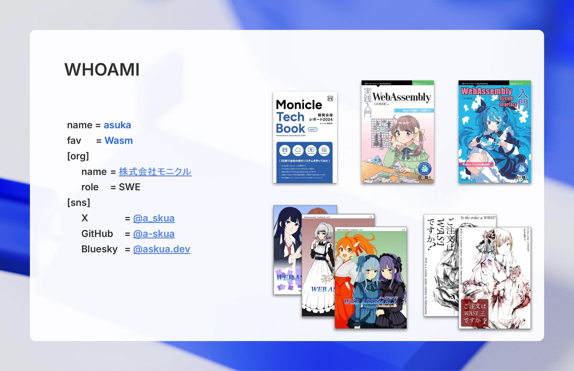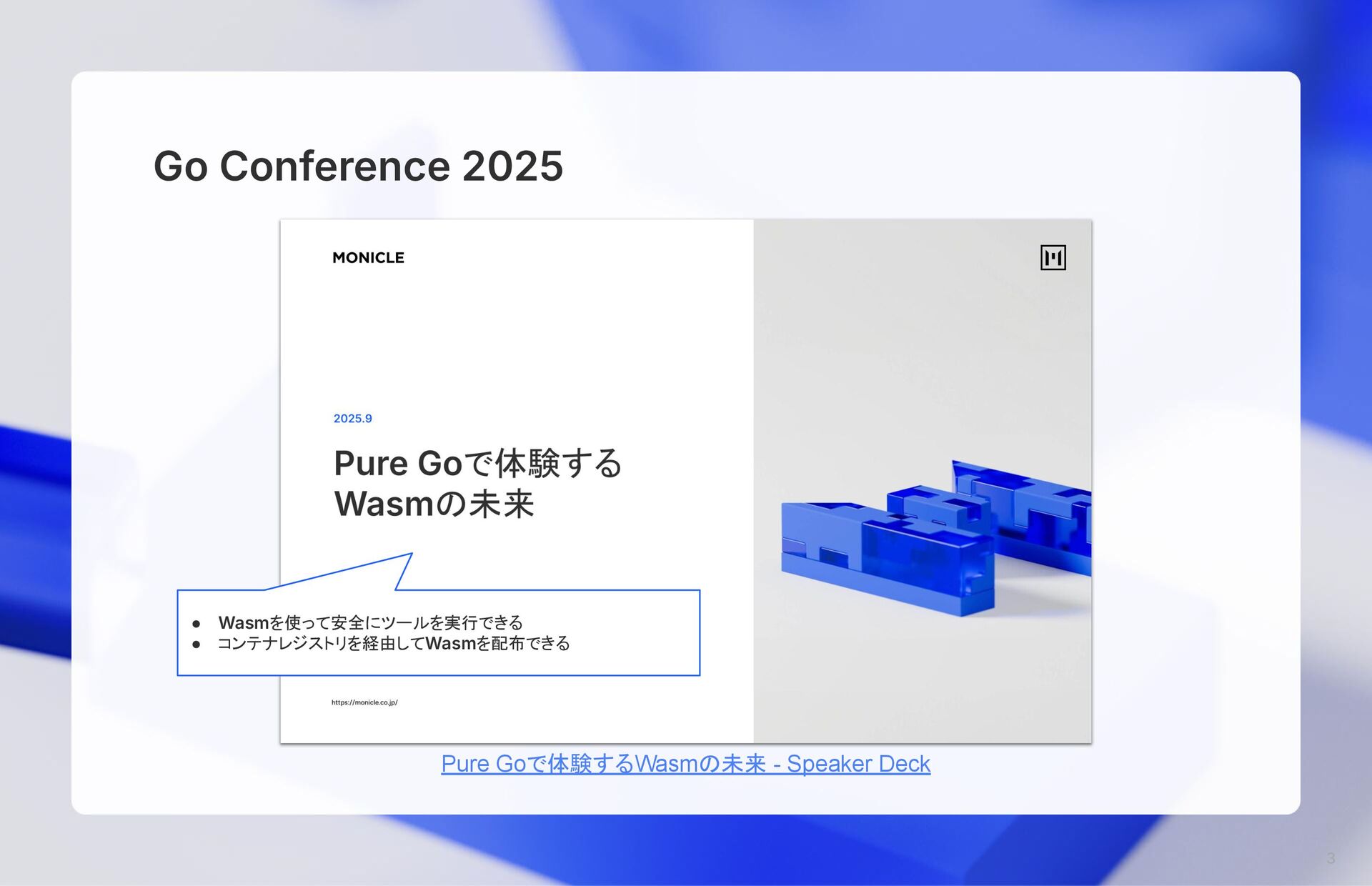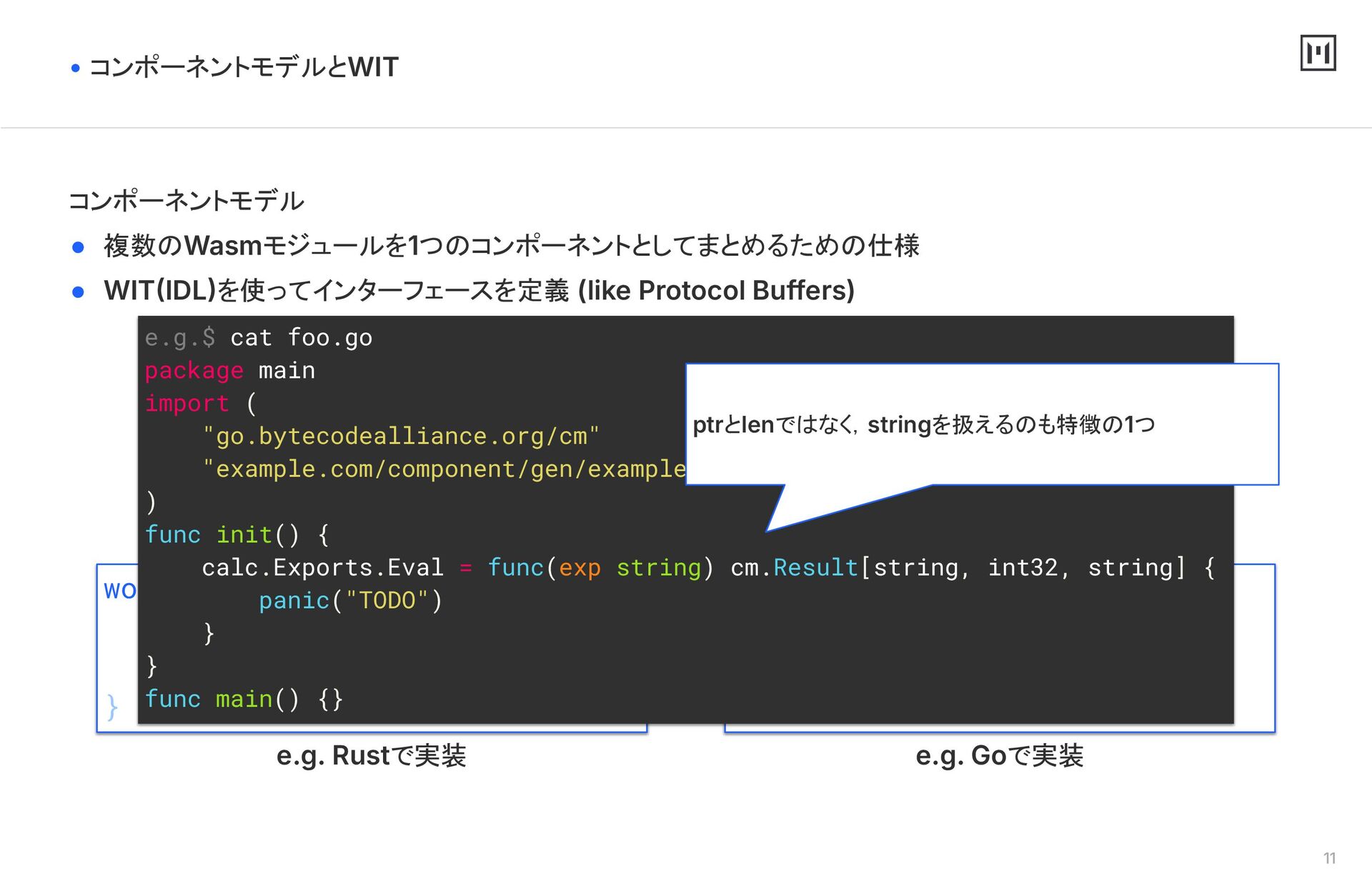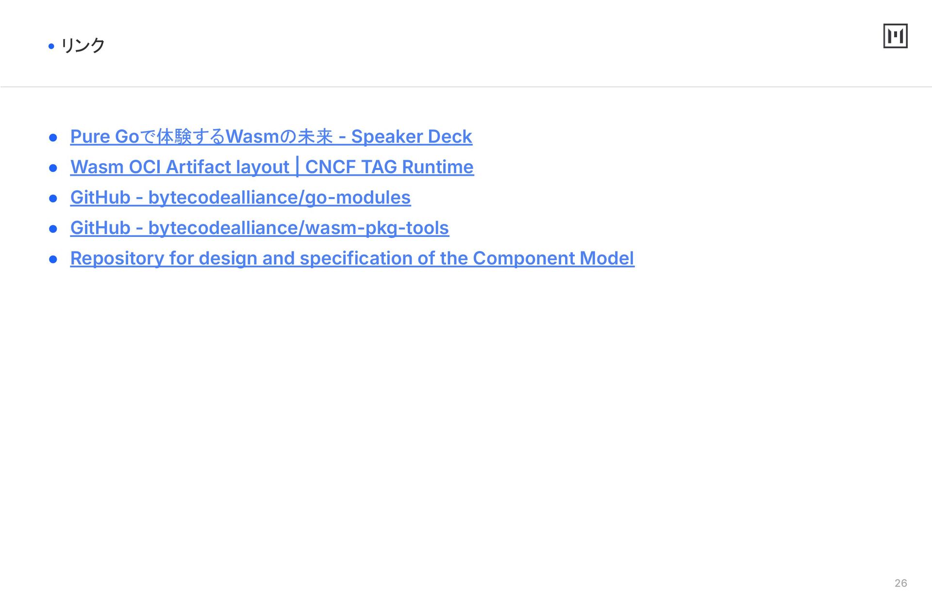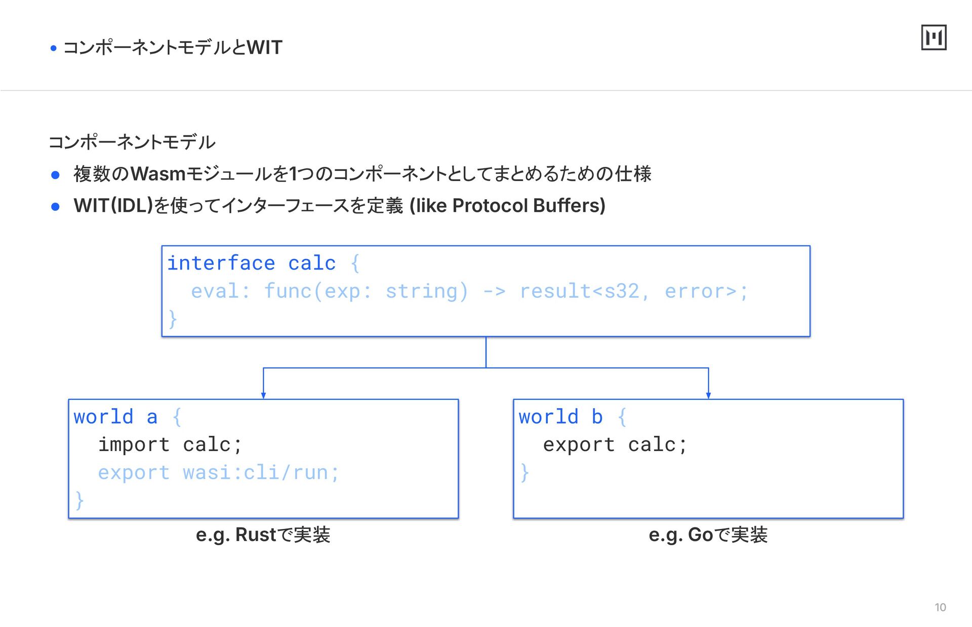 Wasmを汎用バイナリとして利用するためのAPI仕様 WASI 0.1 (=wasip1 - POSIX APIを参考に策定 / ネットワークは未サポート WASI 0.2 (=wasip2 - Wasmコンポーネントモデルをベースに再設計 2018年 8月 G o 1.11 リ リ ー ス W asm サ ポ ー ト 2019年 W A SI 0.1 リ リ ー ス 2023年 8月 G o 1.21 リ リ ー ス W A SI 0.1 サ ポ ー ト 2024年 1月 W A SI 0.2 リ リ ー ス 2024年 8月 W A SI 0.2.1 リ リ ー ス W asm O C I A rtifact layout 2025年 W A SI 0.3 リ リ ー ス ? 2025年 2月 G o 1.24 リ リ ー ス W A SI 0.1 リ ア ク タ ー モ ジ ュ ー ル サ ポ ー ト e.g.$ cat http-server.go package main import ( "fmt" "net/http" ) func handle(w http.ResponseWriter, r *http.Request) { fmt.Fprintf(w, "Hello, 世界!") } func main() { http.HandleFunc("/", handle) fmt.Println("Starting server on :8080") if err := http.ListenAndServe(":8080", nil); err != nil { fmt.Println("Error starting server:", err) } } 標準パッケージはネットワークをサポートしていない GOOS=wasip2 GOARCH=wasmだけだと動かない
